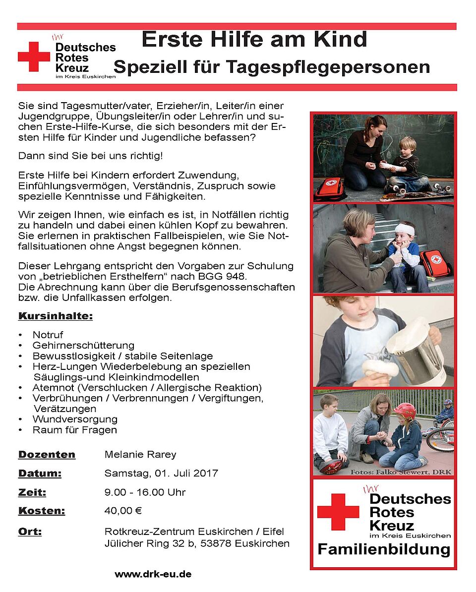 Am 01.07.2017 findet in Euskirchen wieder ein Kurs "Erste Hilfe am Kind" - Speziell für Tagespflegepersonen statt.
