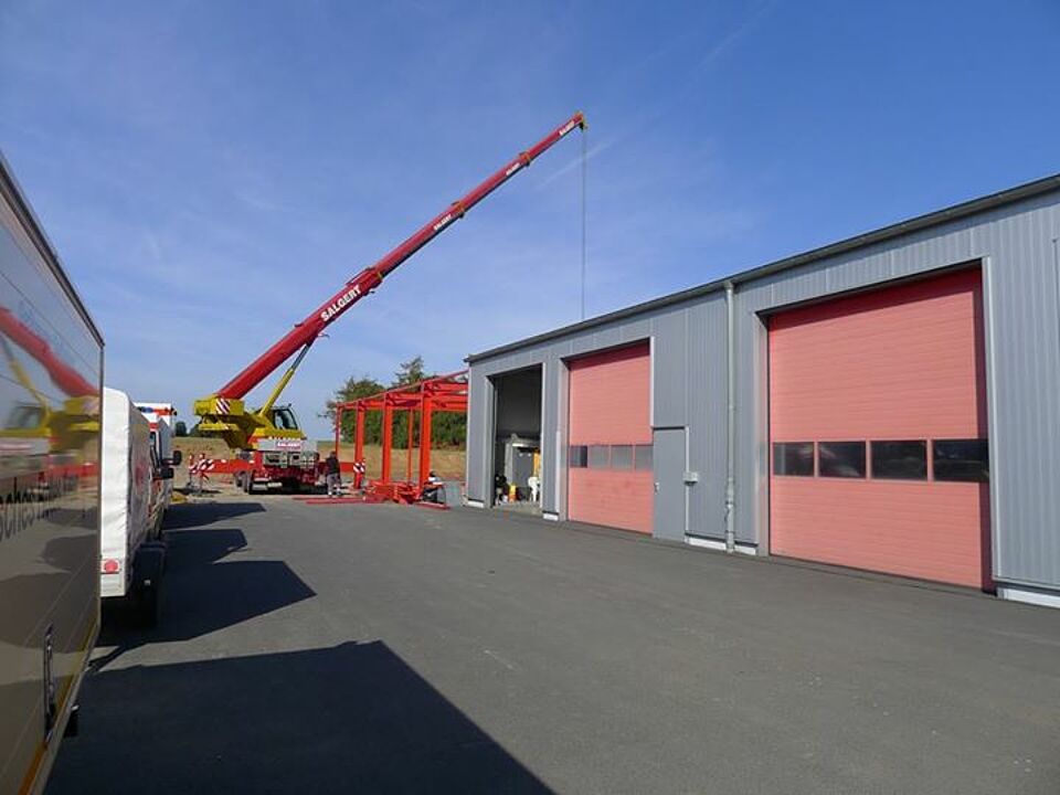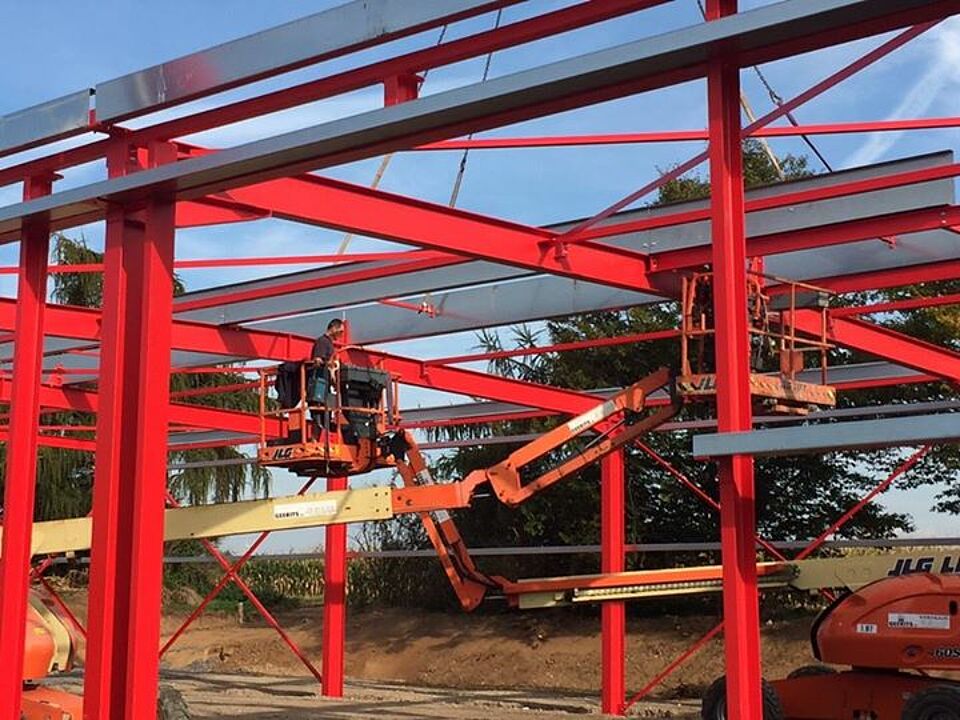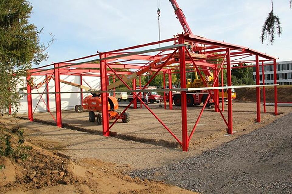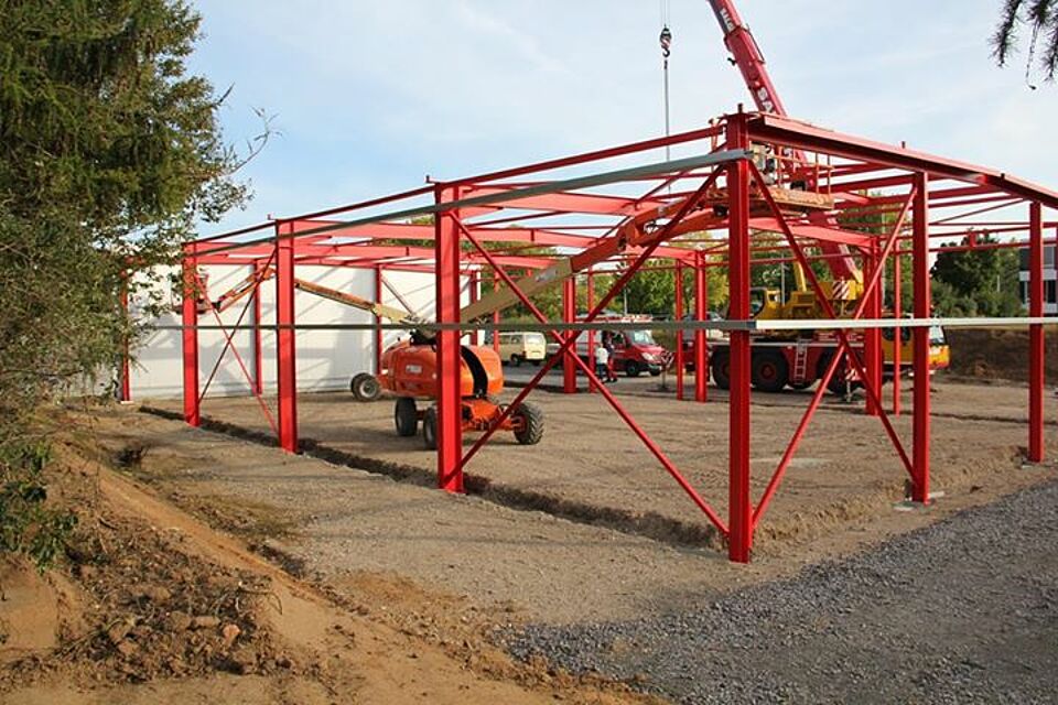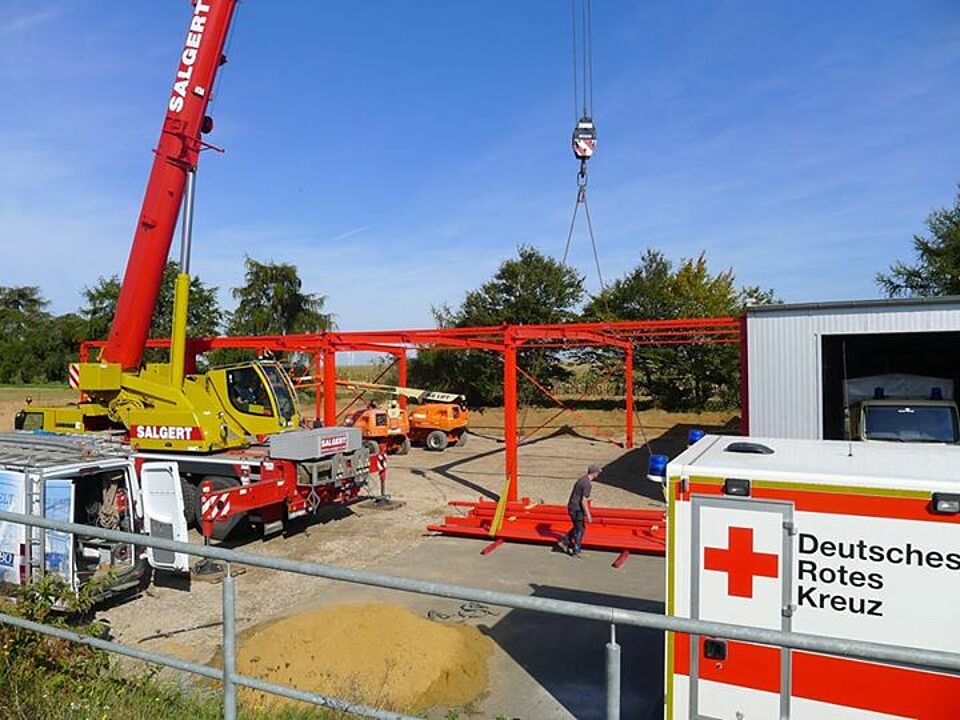 Weiter geht´s mit der Erweiterung der Fahrzeughalle am Rotkreuz Zentrum Euskirchen / Eifel. In dieser Woche wurde bei bestem Wetter das Grundgerüst der Fahrzeughalle montiert. Klasse Arbeit bisher! Wir sind gespannt wie es nächste Woche weitergeht.