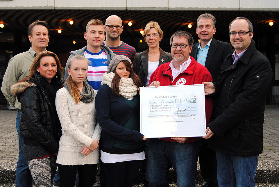 Euskirchen – Dickes Lob von allen Seiten gab es für Schüler des Thomas-Eßer-Berufskollegs in Euskirchen. Denn nachdem diese bereits im Juni Solidarität mit den Opfern des Elbhochwassers bewiesen und der gemeinnützigen Hilfsorganisation Medical Service Düren geholfen hatten, die in riesigen Mengen eingegangenen Sach- und Kleiderspenden für den Transport in die Hochwassergebiete zu sortieren, zu verpacken und zu verladen, veranstalteten sie kurz vor den Sommerferien auch noch einen Sponsorenlauf. An der Aktion im Euskirchener Sportstadion Im Auel beteiligten sich 300 Schüler und ein Teil der Lehrer. Dabei kamen stolze 3.988 Euro zusammen, die nun in Form eines symbolischen Riesenschecks an Rotkreuz-Kreisgeschäftsführer Rolf Klöcker und Einsatzleiter Bert Spilles übergeben wurden.
