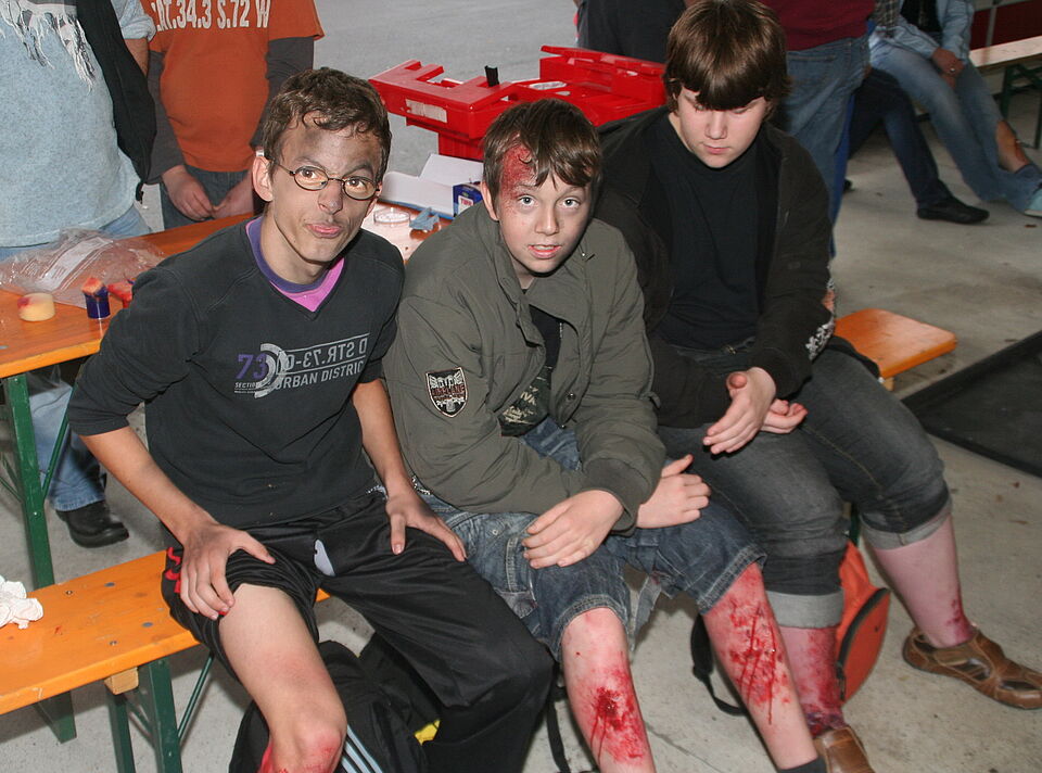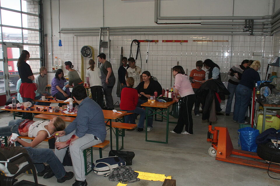 Nach einer fast dreistündigen Arbeit der RUD-Gruppe waren die Darsteller für die Übung vorbereitet. Sie wurden in den Hintergrund der Übung "eingeweiht" und auf ihre Rolle als Verletztendarsteller vorbereitet.
