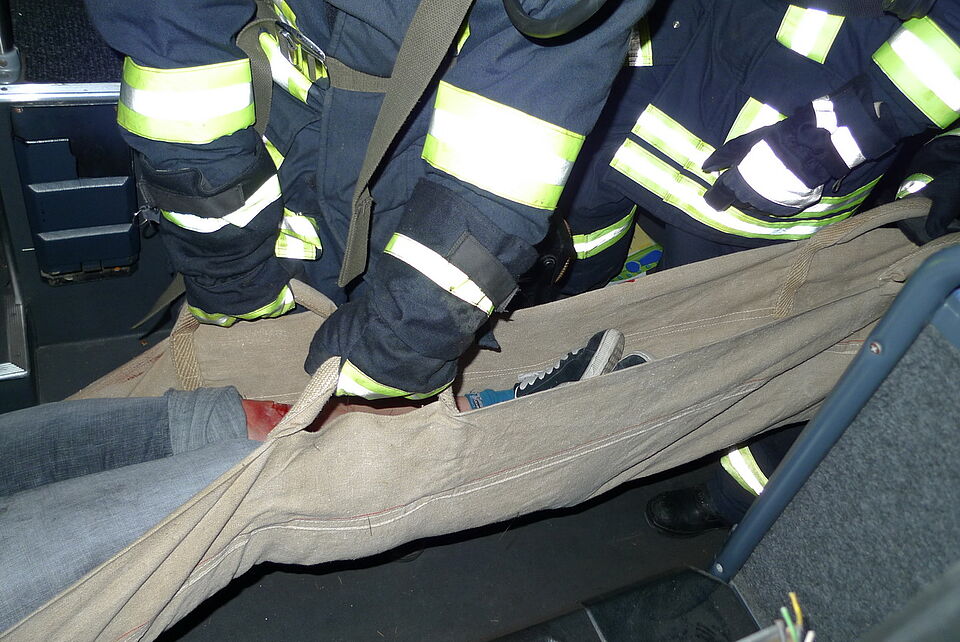Schnellstmöglich verschafften sich die Kameraden der Feuerwehr unter schwerem Atemschutz mithilfe von technischem Gerät einen Zugang zum Bus, um die verletzten Insassen zu retten. Zeitgleich wurde das Feuer gelöscht. Auf der nahegelegenen Patientenablage wurden die Verletzten durch das Rote Kreuz versorgt. Hierbei wurden sie von der Feuerwehr tatkräftig unterstützt.
