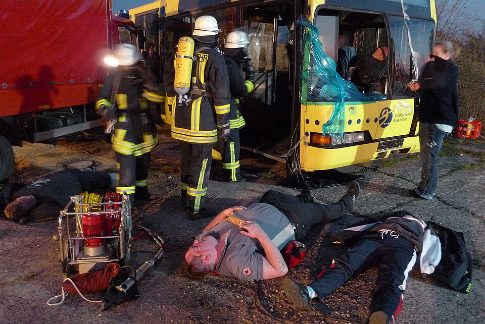 Auf dem Gelände der alten belgischen Kaserne wurde ein Busunglück mit zehn Verletzten nachgestellt. Die Euskirchener Feuerwehr und Rettungsdienstkräfte des Roten Kreuzes kamen bei dieser realistischen Übung zum Einsatz.
