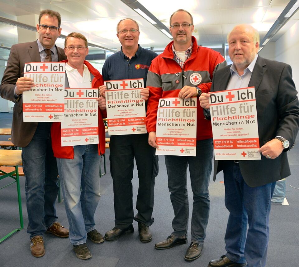 Foto: Felix Kern/pp/Agentur ProfiPress | Gemeinsam im Einsatz für Flüchtlinge in Not (von links): Johannes Winckler, Erster Beigeordneter der Stadt Euskirchen, Herbert Schmitz von der Kreisbereitschaftsleitung des DRK, Rolf-Peter Stupp, stellvertretender Wehrleiter der Euskirchener Freiwilligen Feuerwehr, Rolf Klöcker, Geschäftsführer des DRK-Kreisverbandes und Udo Crespin als Beauftragter des Krisenstabes.