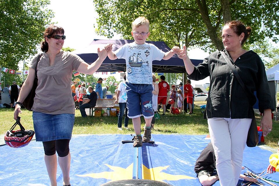 Wenige Meter entfernt ging da gerade der fünfjährige Simon Jahnz aus Euskirchen, gesichert an den Händen seiner Mutter Kerstin und von Britt Hartmann von der Lebenshilfe mühelos über das Drahtseil. Kerstin Jahnz begründete den Besuch auf dem DRK-Gelände so: „Für meine Kinder, die keine Behinderung haben, ist es wichtig, im Kontakt mit Kindern mit Behinderung den Horizont zu erweitern.“