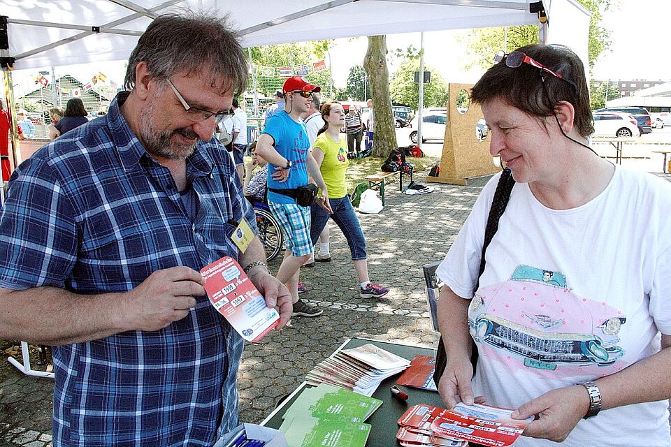 Ältere Semester informierten sich etwa am Stand des „HaLT“-Alkoholpräventionsprojekts. Angelika Wagner aus Euskirchen weiß so seit dem „Tag der Begegnungen“ wie man den „Alterskontrollschieber“ einsetzt: „Ich habe lange an der Tankstelle gearbeitet. Natürlich kamen Jugendliche vorbei, die behaupteten, 18 zu sein. Doch ob sie wirklich schon das 18. Lebensjahr vollendet hatten, war manchmal unklar. Das weiß ich jetzt anhand des Geburtstages, den ich eingebe, genau.“