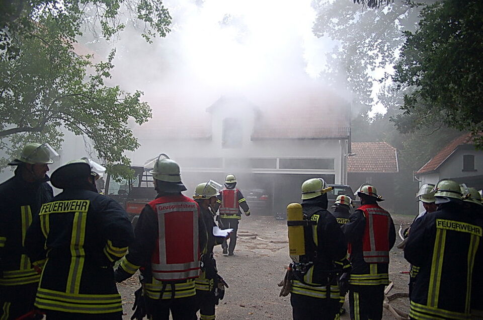 Die ersteintreffende Löschgruppe aus Kirchheim hatte alle Hände voll zu tun. Aus der Garage drang dichter Brandrauch, fünf Verletze Kinder befanden sich vor dem Brandobjekt und das dringend benötigte Löschwasser musste aus einem rund 150 Meter entfernten Löschteich herangepumpt werden. Für eine Löschgruppe alleine war dieser Einsatz nicht zu schaffen.