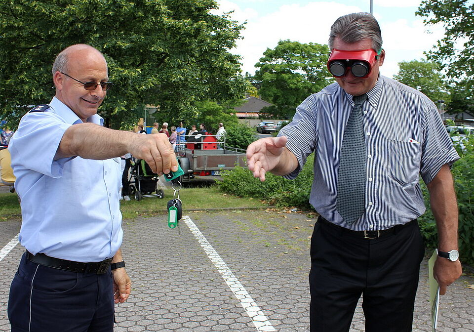 „Der Feuerwehr haben wir es zu verdanken, dass wir auch das Kistenklettern anbieten können“, berichtete Froebus. Die nämlich war eigens dafür mit dem Drehleiterwagen angerückt. Und auch die Kreispolizei war am Start: Mit Rauschbrillen konnten hier alle erfahren, wie Alkohol und Drogen die Wahrnehmung beeinflussen. Für den Rauschbrillen-Parcours standen Kettcar und Dreiräder bereit, so dass auch in ihrer Mobilität eingeschränkte Besucher daran teilnehmen konnten.