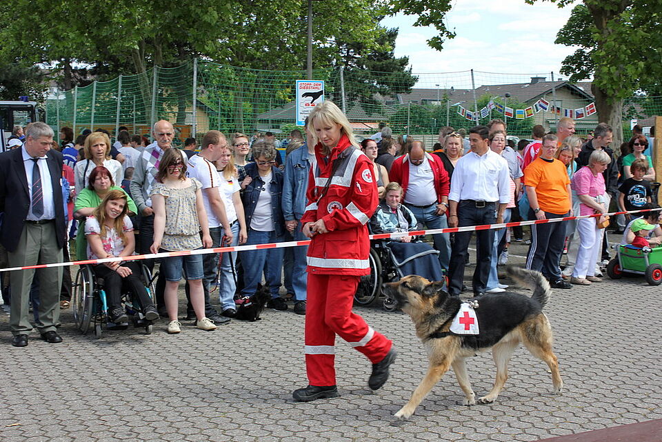 Gegen 15 Uhr dann knubbelten sich die meisten Gäste auf engem Raum, denn die Vorführung der Kaller Rotkreuz-Hundestaffel wollte sich kaum jemand entgehen lassen. Viel zu schnell ging so ein weiteres Kapitel in der Erfolgsgeschichte „Tag der Begegnung“ zu Ende, für das schon gegen 8 Uhr morgens Menschen mit und ohne Behinderung gemeinsam mit dem Aufbau begonnen hatten – und schließlich gemeinsam aufräumten.
