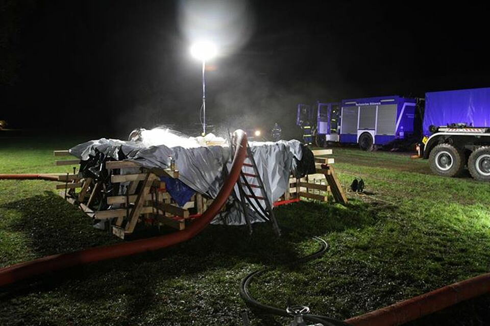 Jetzt ist der fiktive Großbrand an der Kölner Strasse gelöscht und die Wasserförderung wurde eingestellt. Nach einem stärkenden Frühstück heisst es für alle ehrenamtlichen Einsatzkräfte, das Material zu säubern, wieder zu verpacken und dann in die Unterkünfte zu bringen. Dort steht dann natürlich noch die Fahrzeugpflege an.