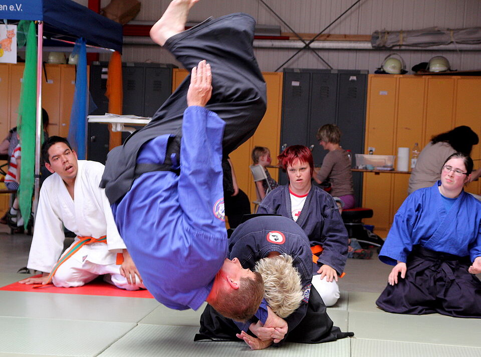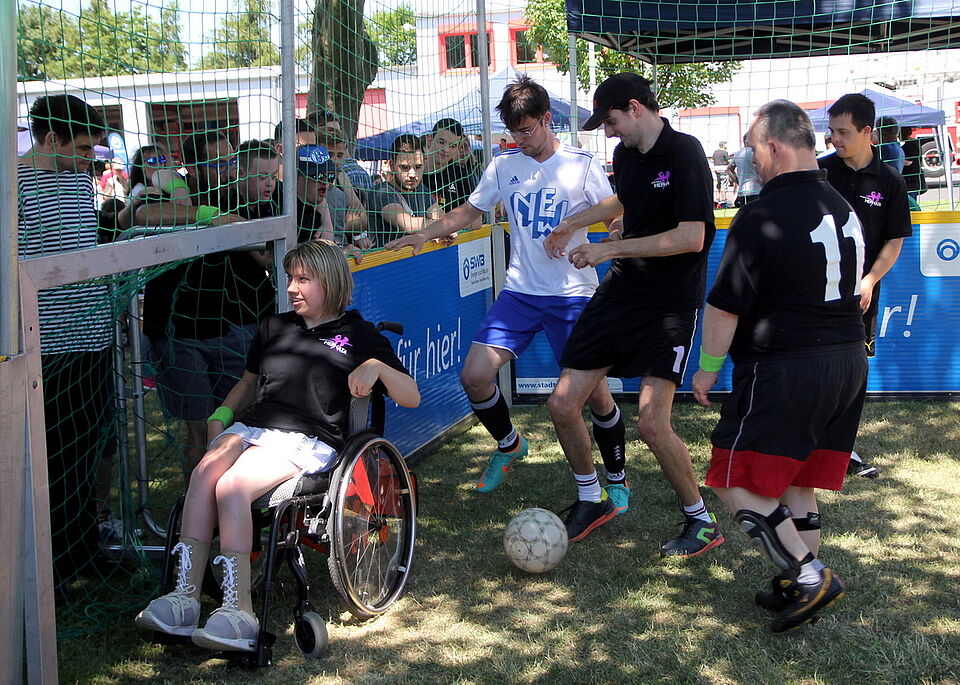 Darum geht es auch Roman Brandt. Der Tanzlehrer bietet inklusive Zumba-Kurse an. Bei seiner Vorführung zeigt die bunt gemischte Gruppe ihr Können. Die Frau im Rollstuhl, der von einer anderen Frau bewegt wird, sieht man ebenso den Spaß an, wie dem jungen Mann mit Down-Syndrom und Claudia Rapp, die den „Tag der Begegnung“ vonseiten der Lebenshilfe Euskirchen organisiert und ebenfalls mittanzt. „Den Kursus gibt es erst seit 1,5 Monaten“, sagt sie hinterher.