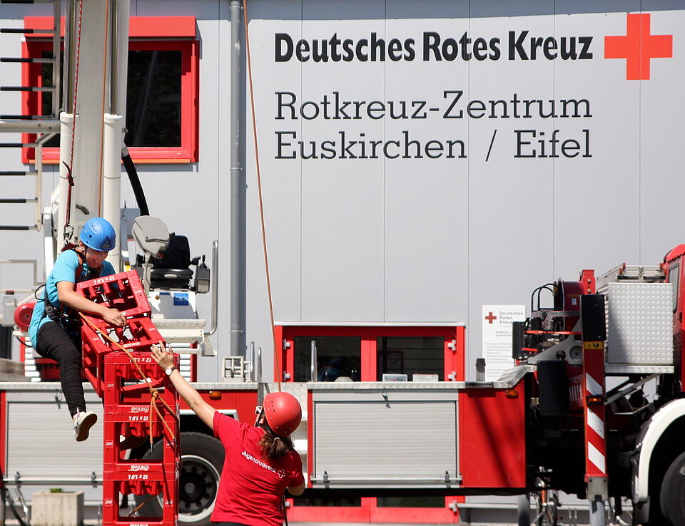 Das Rote Kreuz stellt nicht nur sein Gebäude zur Verfügung und sorgt mit der Euskirchener Küchencrew dafür, dass jeder Besucher gesättigt ist, sondern beteiligt sich mit mehreren Attraktionen am Programm. Die Rettungshundestaffel aus Kall zeigt am Nachmittag wieder einmal beeindruckend, was die Tiere zu leisten imstande sind. Zum ersten Mal dabei ist die Hüpfburg des Jugendrotkreuzes, bestehend aus einem großen, mit Luft gefüllten Rettungswagen.