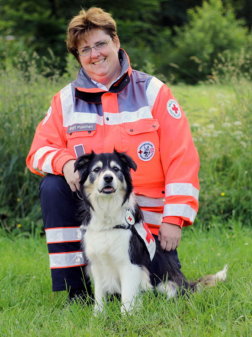 Darunter auch Birgit Poschen mit der dienstältesten Hündin der Rettungshundestaffel, der elfjährigen Border-Collie-Hündin „Jessie“, die schon nach einigen hundert Metern den vermissten Senior in einem nicht einsehbaren Bereich aufgespürt hatte. Er lag im Mündungsbereich des Veybachs in die Erft . „Man konnte den Mann vom Weg aus im hohen Gras nicht sehen“, berichteten die Einsatzkräfte. „Das ist genau die Stärke der Hunde: Sie suchen nicht mit den Augen, sondern mit ihrer feinen Nase“, erklärte DRK-Einsatzleiterin Julia Tiede.