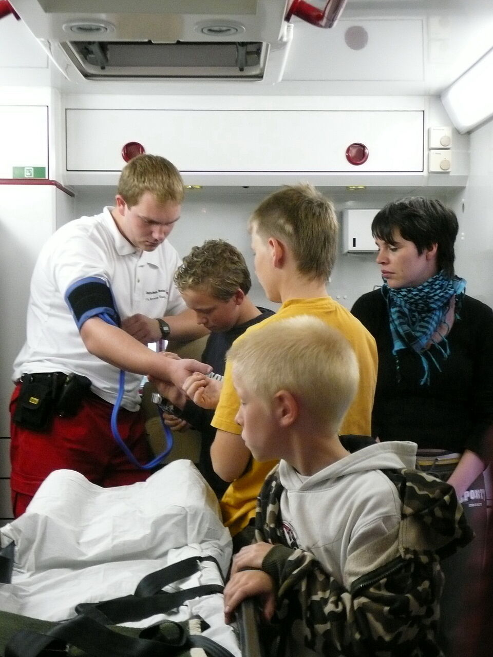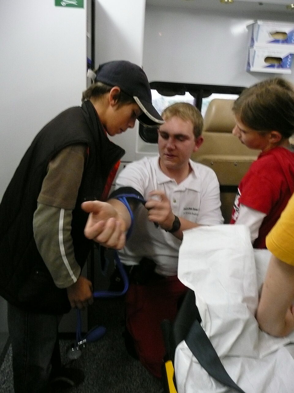 Bild JRK EU | Hier zeigen Daniel und Laura ihrer Gruppe das Innenleben eines Rettungswagen - und was da so alles im Ernstfall zu tun ist.