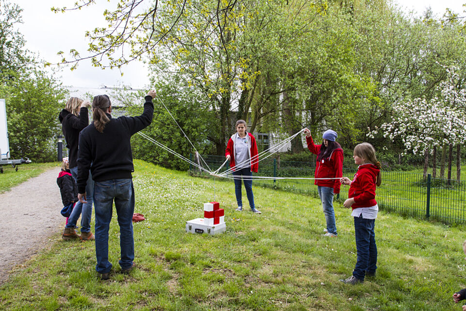 Bild DRK JS | Hier gilt es im Team aus 9 Holzsteinen ein Rotes Kreuz zu bauen.