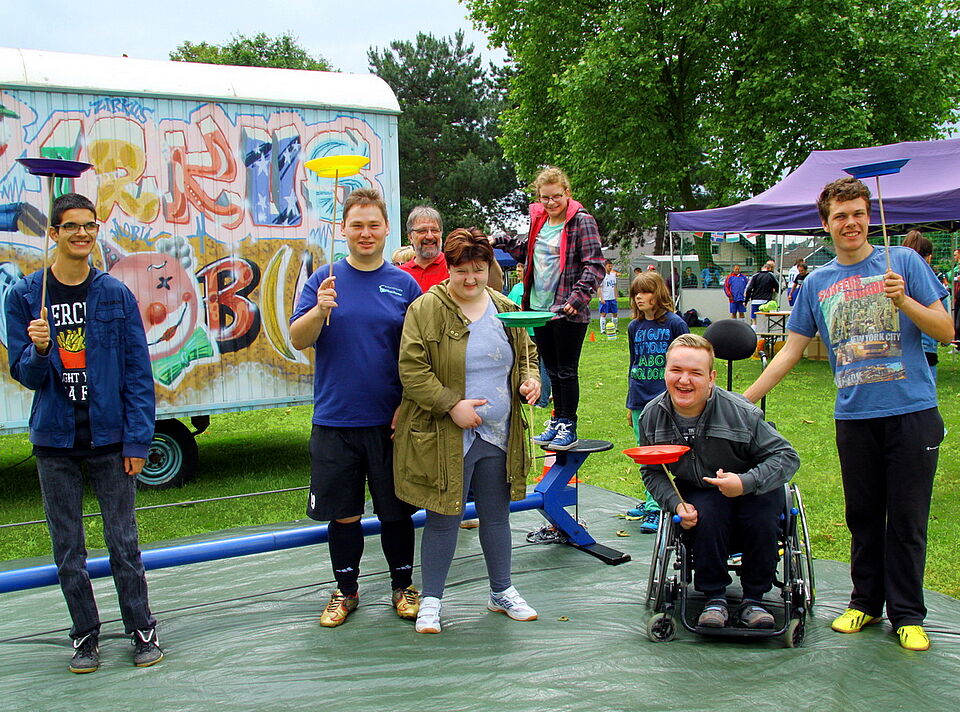 Ein Beispiel für ein gelungenes Projekt dieser Art war das Zirkusprojekt, das die Caritas, die Lebenshilfe, die Nordeifel-Werkstätten und die Zülpicher Karl-von-Lutzenberger-Realschule in der Woche vor dem Fest veranstaltet hatten. 16 Teilnehmer, darunter Schüler und einige junge Menschen mit Behinderung, erarbeiteten eine Woche lang mit Thomas Stihl von der Suchtprävention der Caritas und Thomas Münnix von der Kölner „Zirkusfabrik“ ein Programm, das auf dem Tag der Begegnung präsentiert wurde. „Man muss darauf achten, dass sich jeder gleich viel einbringen kann“, erklärte Münnix. Jeder solle zeigen können, was er gelernt habe. Das klappte dann schon am Stand wunderbar, wo die Teilnehmer den vielen neugierigen Gästen ihre Kunststücke zeigen konnten.