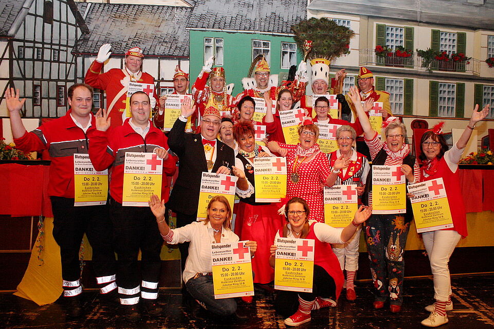 Um die Blutspende besser zu vertragen, sollten die Freiwilligen vor der Spende möglichst ausreichend essen und trinken. Nach dem Aderlass sorgen die Rotkreuz-Helfer mit einem karnevalistischen Büffet für eine leckere Stärkung im bunt geschmückten Saal. Karneval und das Rote Kreuz gehören für die Euskirchener Blutspendebeauftragte Edeltraud Engelen zusammen – und das nicht nur wegen der Farbkombination „Rut un Wiess“: „Wir sind froh und dankbar für die Bereitschaft der Karnevalisten und aller Blutspender, ihre Ärmel hochzukrempeln, um anderen Menschen zu helfen.“