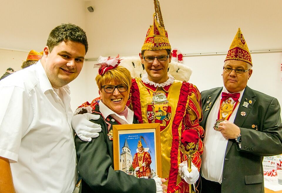 Mit rheinischer Heiterkeit steckten sie den kleine Piekser am Ohr zur Entnahme der Kontrolle-Probe und auch den Stich mit der Nadel weg. Nicht nur ihr Blut brachten Karnevalisten und Tollitäten aus dem Euskirchener Stadtgebiet mit, sondern auch jede Menge gute Laune. Im Gepäck hatte Euskirchens Tollität Prinz Frank II. (Hannemann) eine Tusch-Maschine, die er an die Euskirchener Blutspendebeauftragte Edeltraud Engelen übergab. Diese machte reichlich Gebrauch von dem Gerät und hatte für jede Gelegenheit den richtigen Sound parat: 16 verschiedene Karnevalsklänge hat die batteriebetriebene „Stimmungskanone“ auf Lager.