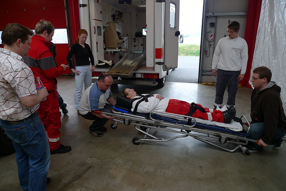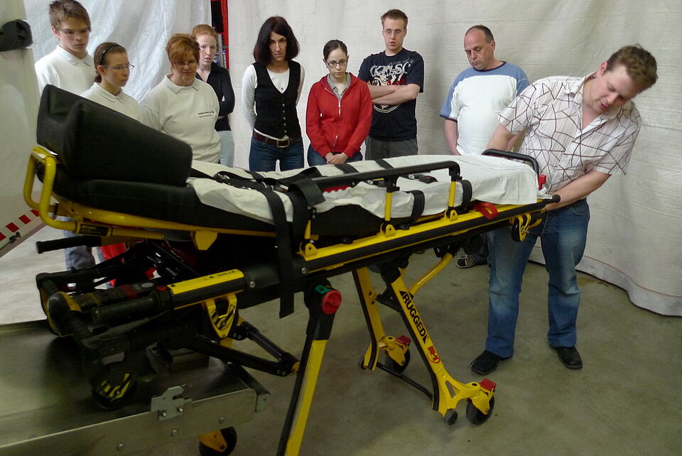 Bild DRK ZR | Lehrrettungsassistent Sebastian Schlüper demonstriert den richtigen Umgang mit der Fahrtrage.