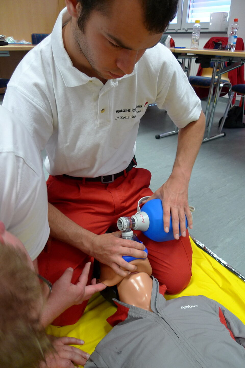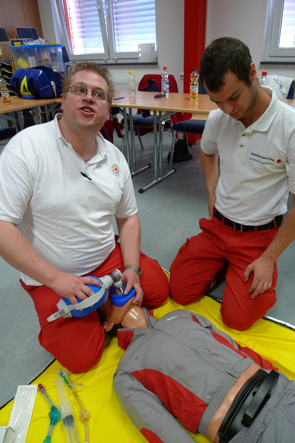 Bild DRK ZR | Thorsten Züll (v.l.), Rettungsassistent aus Kall, übt die Beatmung mit einem Beatmungsbeutel
