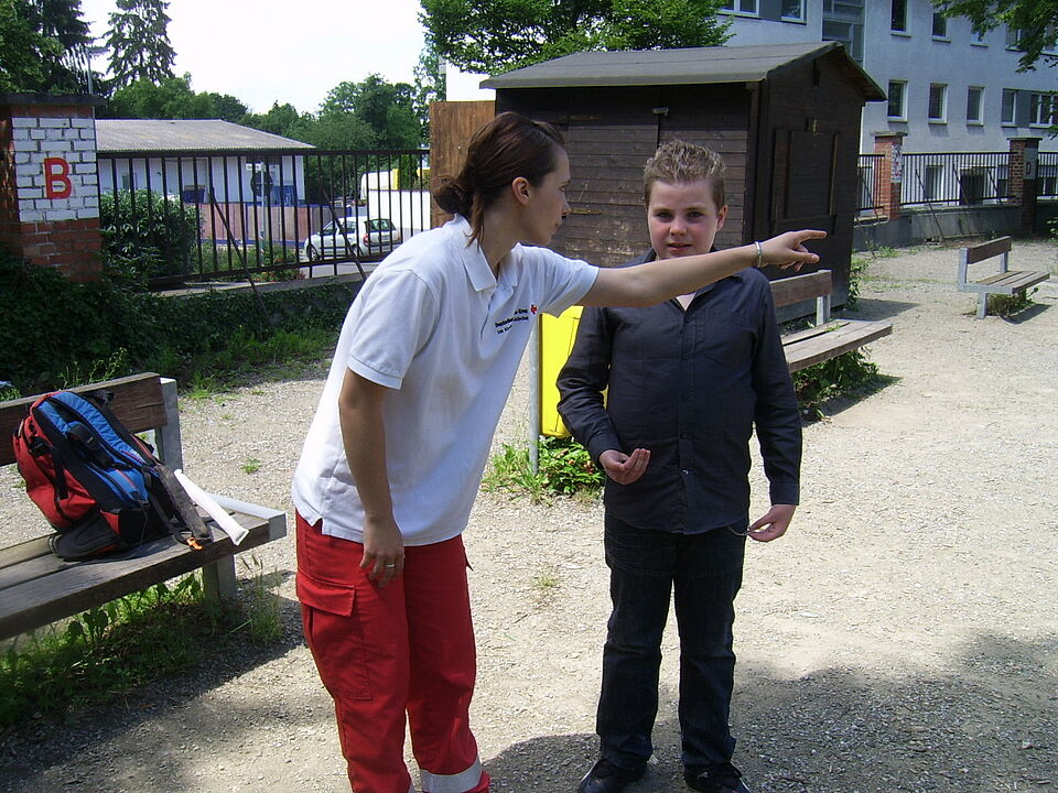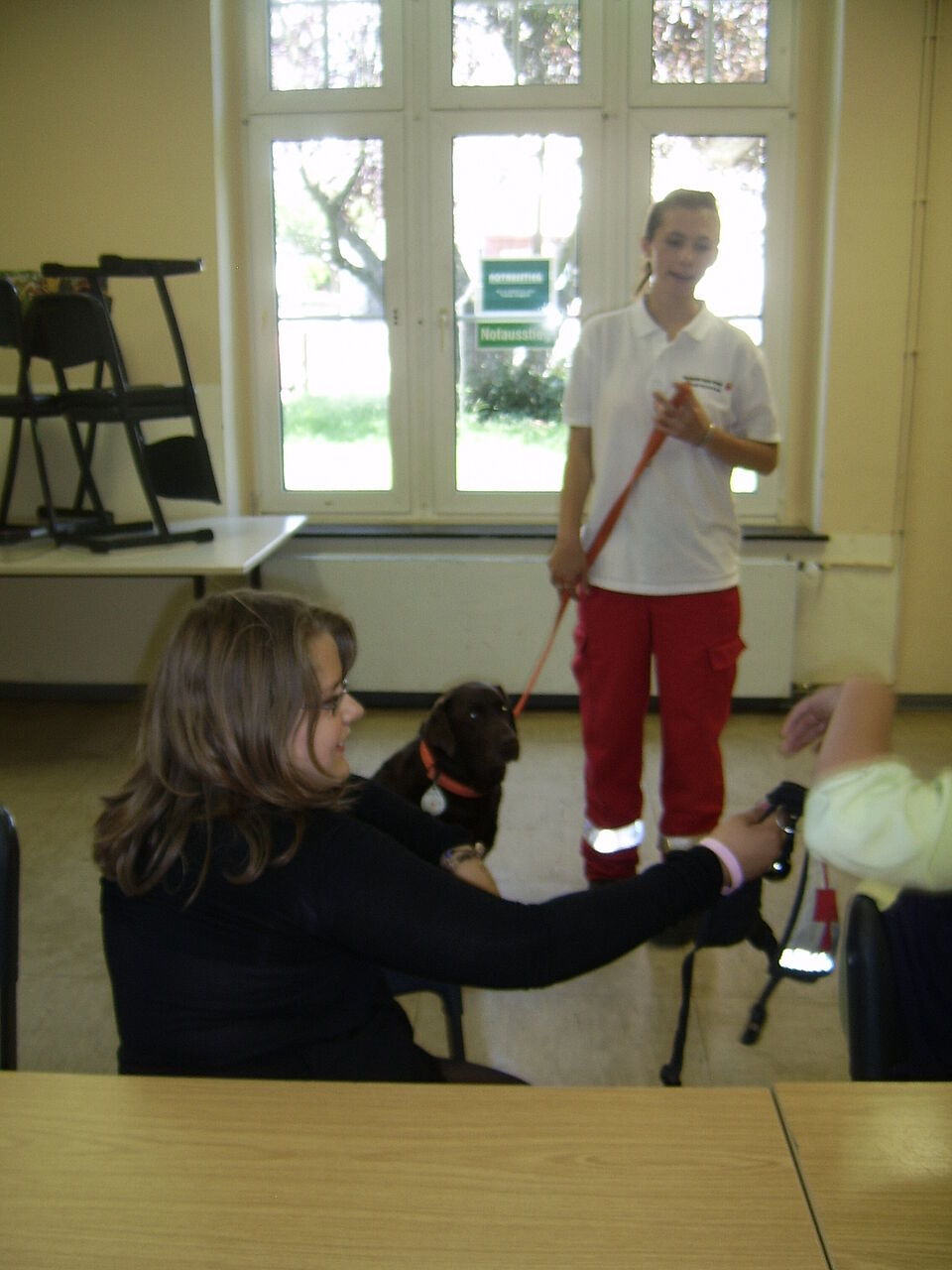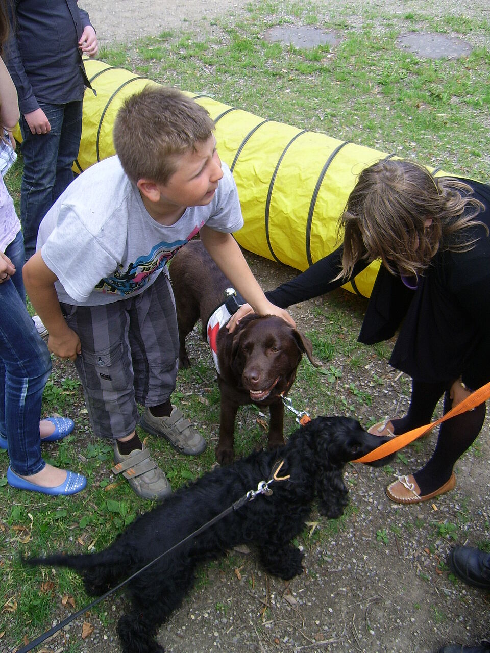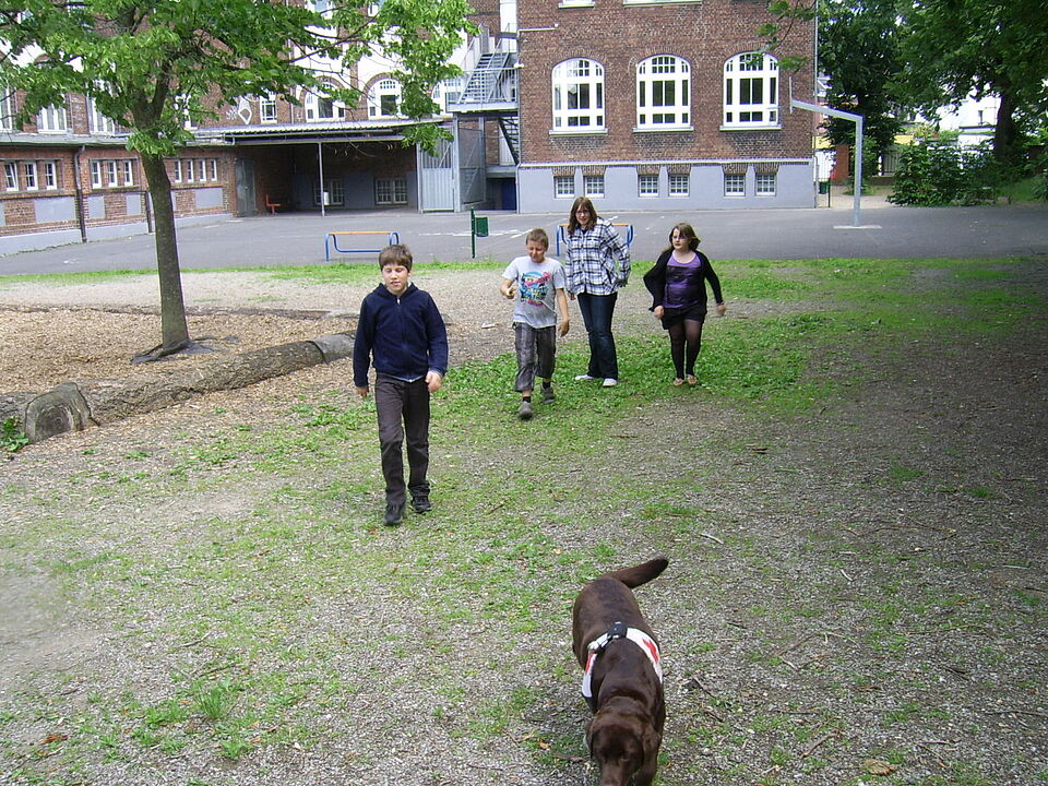 Sehr anschaulich war es, als Julia Tiede den Kindern danach auf dem Schulhof vorführte, wie die Hunde mit ihrem Hundeführer arbeiten. Unter anderem durften sich zwei der Kinder verstecken und wurden von dem Rettungshund aufgespürt. Der andere Hund, ein Cockerspaniel, lernten die Kinder, ist ein Besuchshund der z. B. in Altenheimen eingesetzt wird um dort den Bewohnern den Kontakt zu Tieren zu ermöglichen. Er durfte von den Kindern gestreichelt und geknuddelt werden, was alle auch ausgiebig taten.