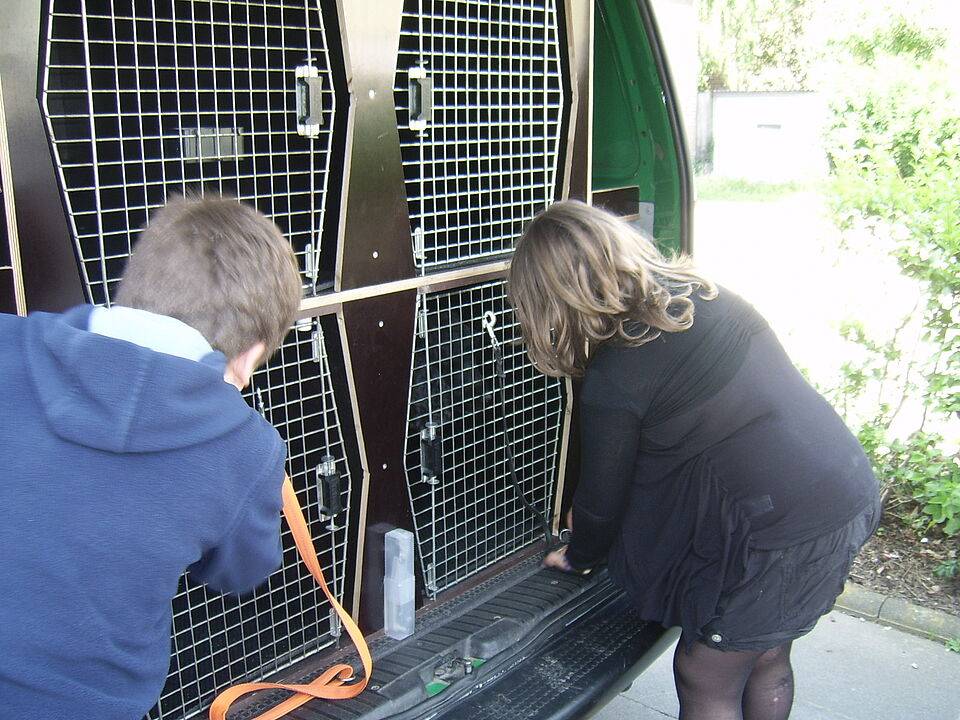 Zur Verabschiedung brachten die Kinder die Hunde zum Auto und lernten abschließend das Einsatzfahrzeug der Rettungshundestaffel kennen.