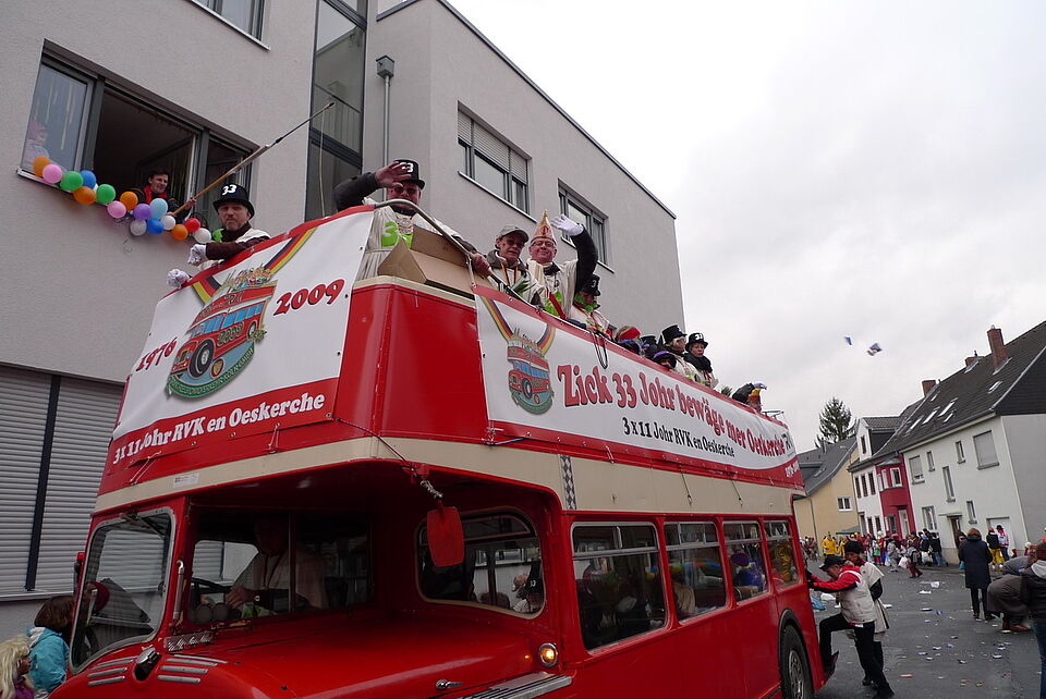 Bild DRK EU | Die RVK ist zu ihrem närrischen Jubiläum (33 Johr en Oeskerche) mit ihrem Oldtimer unterwegs. RVK-Chef Eugen Puderbach hat viel Spaß mit seiner Truppe.