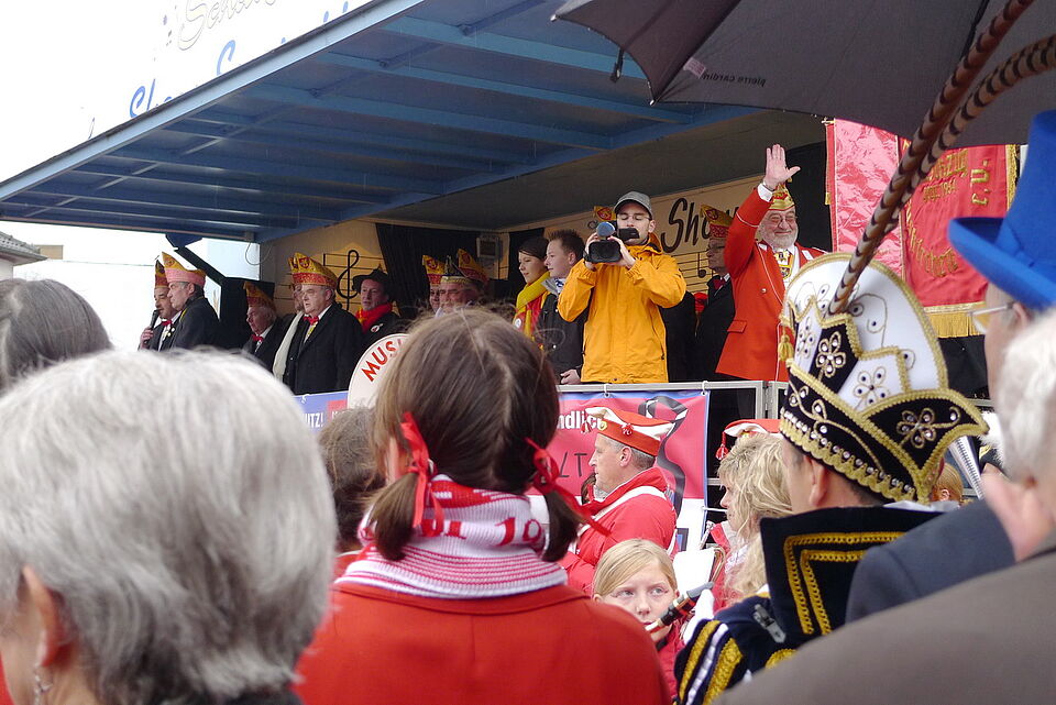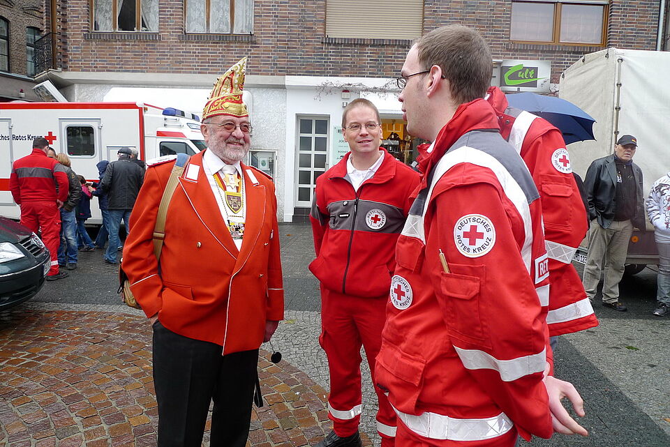 Bild DRK SP | Am Alten Markt herrschte trotz suboptimalen Wetters gute Stimmung. Links in Roter Jacke auf dem Wagen: Erwin Doppelfeld, sowohl Vorstandsvorsitzender des Roten Kreuzes in Euskirchen, als auch aktiver Karnevalist...