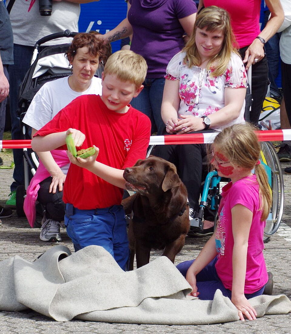 Besonders beliebt war wieder einmal die Vorführung der Rettungshundestaffel. Die Hunde und ihre ehrenamtlichen Hundeführer demonstrierten den Zuschauern, wie bei der Ausbildung gearbeitet wird. So liefen sie nicht nur über schmale Holzbohlen, sondern auch über Leitern und sprangen sogar einen Feuerreifen. Nach der Vorführung durften die Hunde von den Besuchern gestreichelt werden.