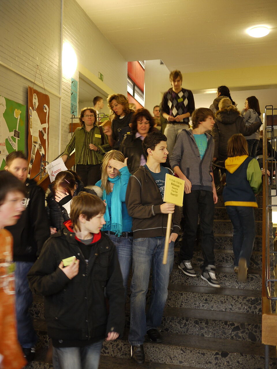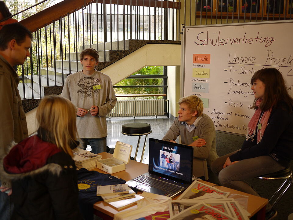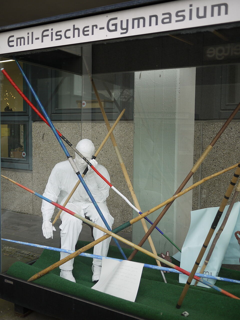 Beim großen Tag der offenen Tür des Euskirchener Emil-Fischer-Gymnasiums gibt es allerhand zu sehen. Auch Daniel Schwarz und Alexander Münch vom Euskirchener Jugendrotkreuz sind mit dabei und präsentieren heute die Arbeit des Schulsanitätsdienstes im Roten Kreuz.