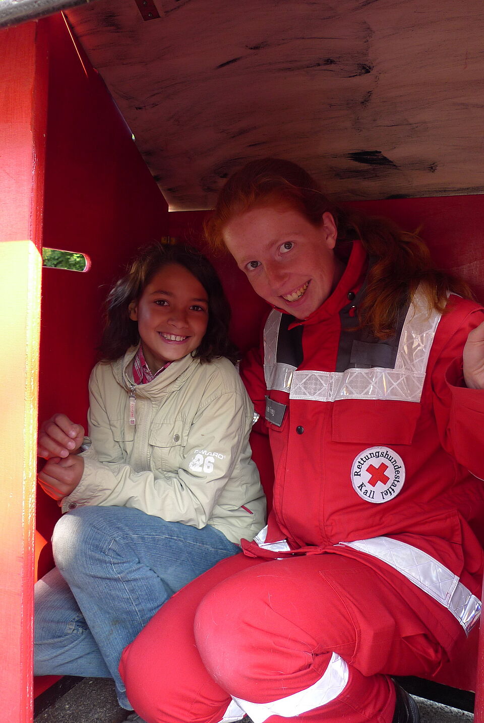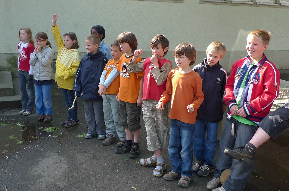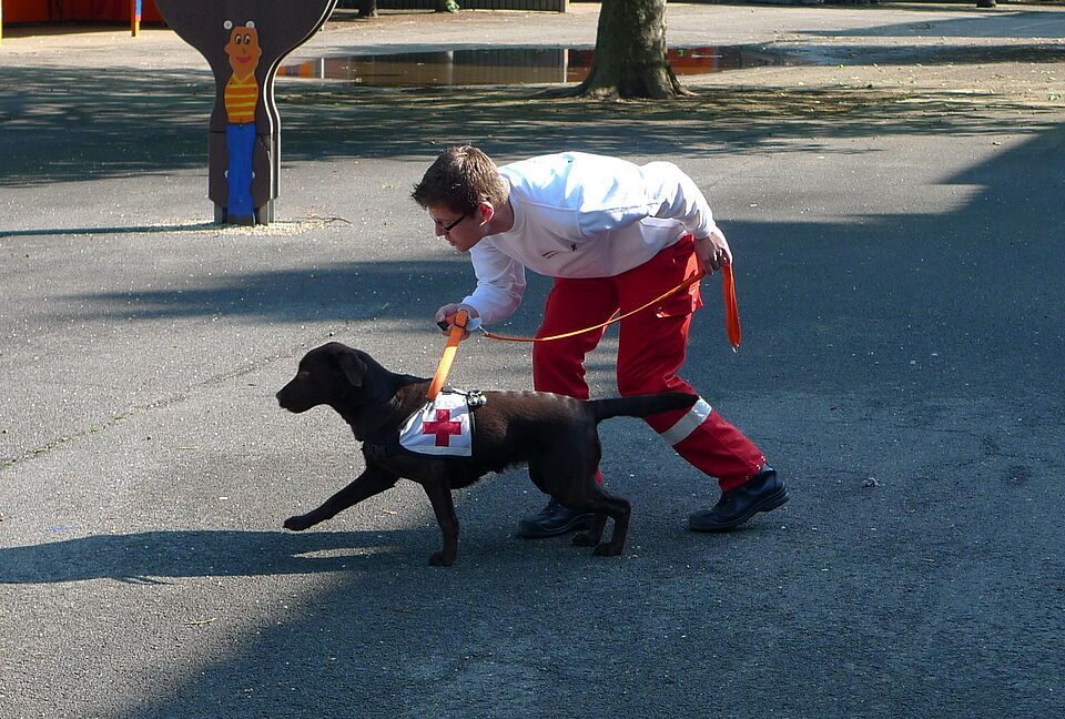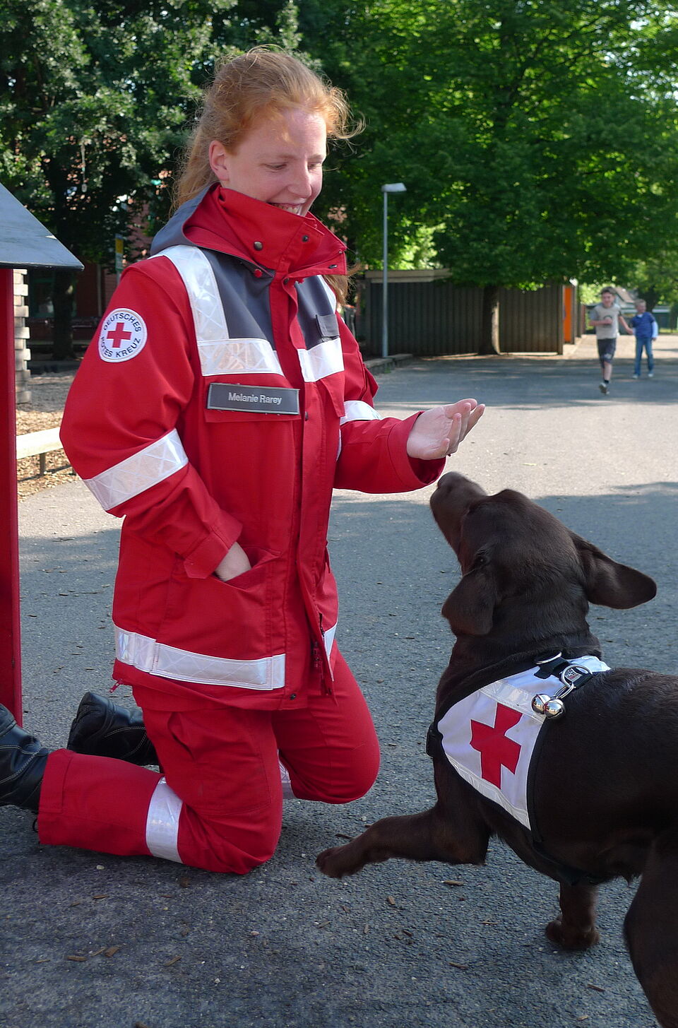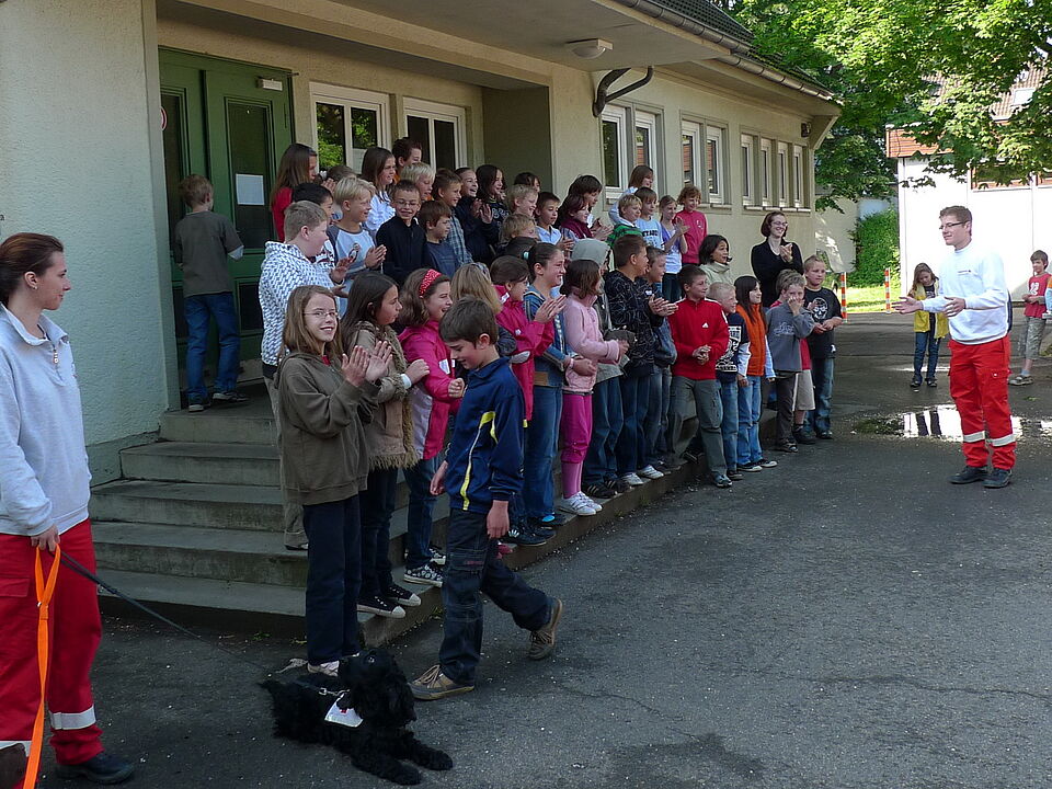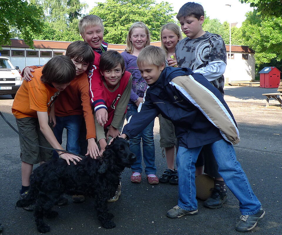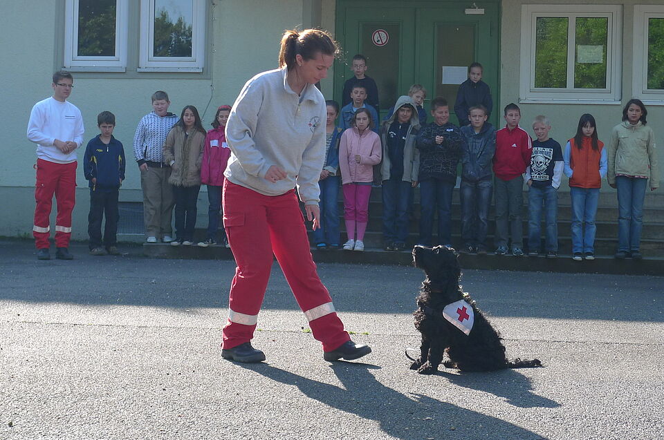 Die Kaller Rettungshundestaffel vermittelt den Schülern der 4c der Franziskusschule in Euskirchen die Arbeit der Suchhunde im Roten Kreuz.