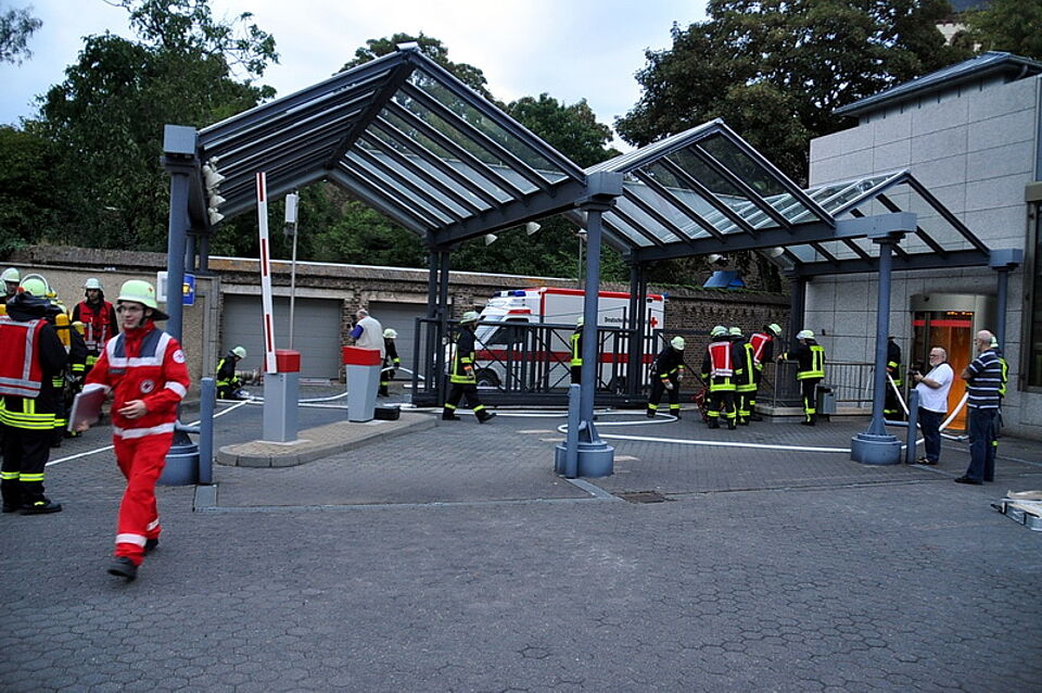 Das Rote Kreuz der Kernstadt hatte derweil gemeinsam mit den Kollegen der Feuerwehr eine Patientenablage auf dem Hof der Sparkasse eingerichtet. Neben der Versorgung der verletzten Person hatten sie auch ein Auge auf die Feuerwehrkollegen. Im Falle eines Falles hätten sie schnell eingreifen und entsprechende Hilfe leisten können.