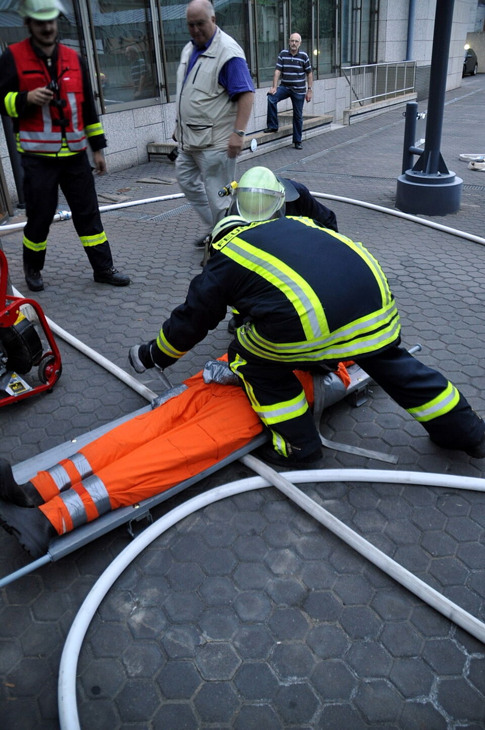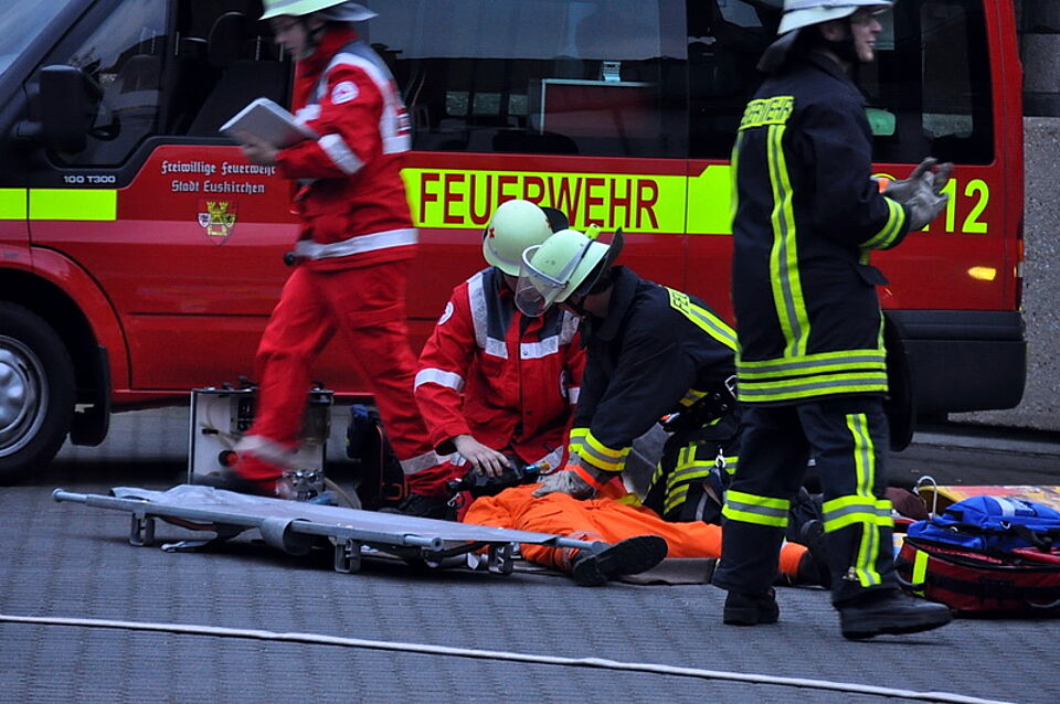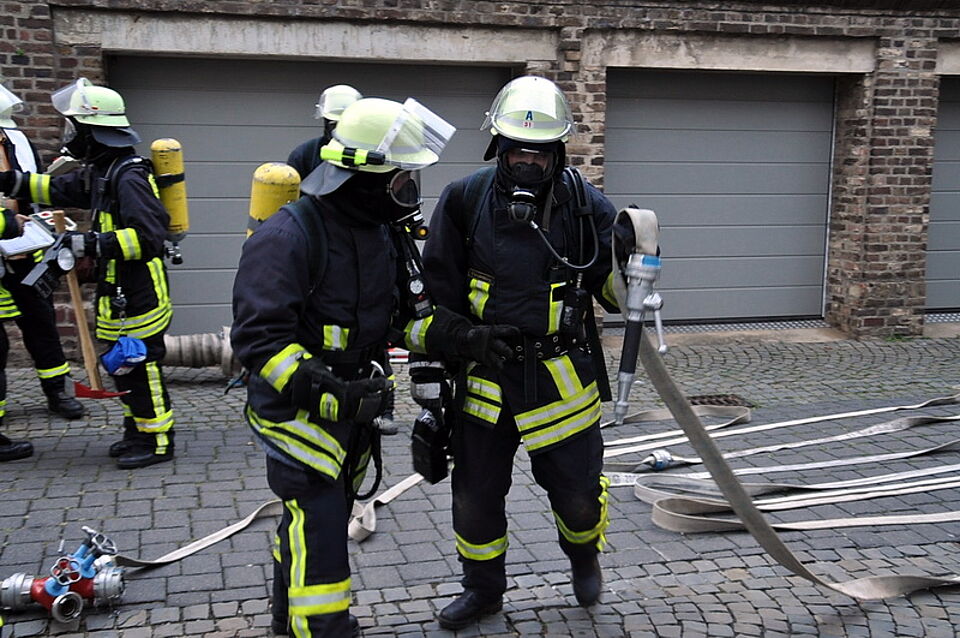 Euskirchen-Zentrum - Eine imposante Übung auf dem Gelände der Euskirchener Kreissparkasse am Kirchwall hatten sich die Übungsleiter der Feuerwehr einfallen lassen. Normalerweise ist der Löschzug III der Euskirchener Wehr auf dem Gebiet Kirchheim, Flamersheim, Niederkastenholz und Palmersheim im Einsatz, doch am vergangenen Freitag mussten die Einsatzkräfte ins Euskirchener Stadtgebiet "ausrücken".