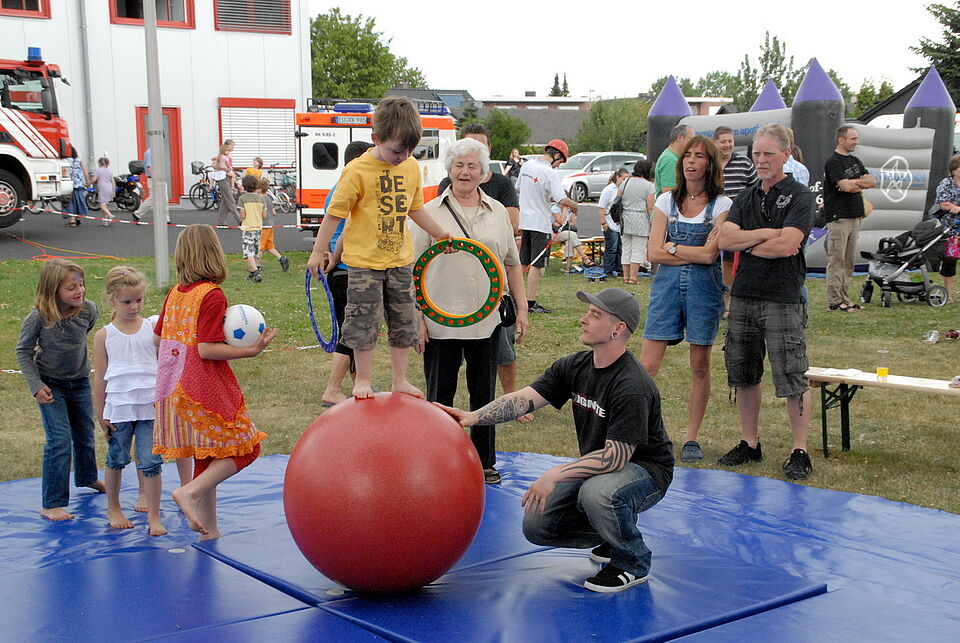 Nicht weniger Aufmerksamkeit wurde dem nachmittäglichen Auftritt der Rotkreuz-Rettungshundestaffel zuteil. Moderiert von Leiter Franz Küpper, zeigten die Mensch-Hund-Teams die Ergebnisse der intensiven wöchentlichen Ausbildung: Die vierbeinigen Retter balancierten über Leitern und Bretter, krochen durch eine Röhre und ließen sich - Omas Nerzkragen gleich - auf den Schultern ihrer Führer tragen. Zum krönenden Abschluss sprangen einige der Hunde sogar durch einen brennenden Reifen. Die beeindruckende Vorführung honorierten die begeisterten Zuschauer mit kräftigem Beifall, danach standen Zwei- und Vierbeiner für Fragen und Streicheleinheiten zur Verfügung.