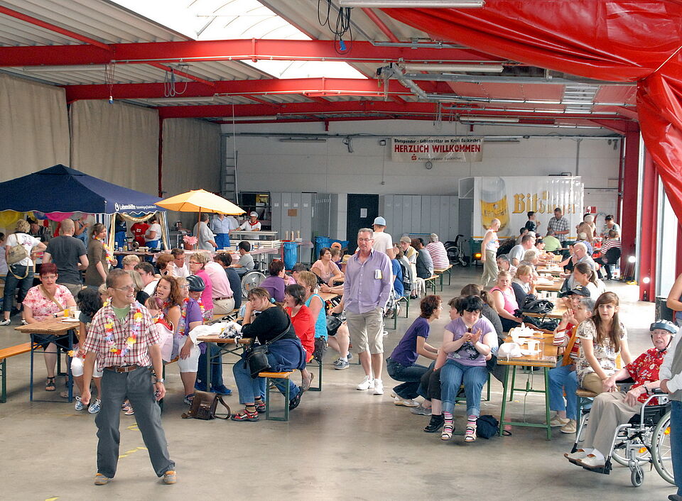 Wie Bodo Froebus berichtete, lieferte die Fußball-Weltmeisterschaft der Behinderten 2006 die Initialzündung für den Begegnungstag, als Euskirchen Austragungsort für ein WM-Spiel war. Damals hatte die Lebenshilfe die Organisation übernommen und wurde dabei von Kreissportbund und Rotem Kreuz unterstützt. „Die Zusammenarbeit hat so gut funktioniert und das Interesse der Bevölkerung war derart groß, dass die Idee des Begegnungstages geboren wurde“, so Froebus. Seitdem erfreut sich die Veranstaltung ungebrochen großen Interesses, und das längst nicht nur bei behinderten Menschen und ihren Angehörigen. Davon zeugte auch am Sonntag wieder der zahlreiche Besuch: Bis zum späten Nachmittag herrschte auf dem Außengelände und in der mit Tischen und Bänken möblierten Fahrzeughalle dichtes Gedränge.