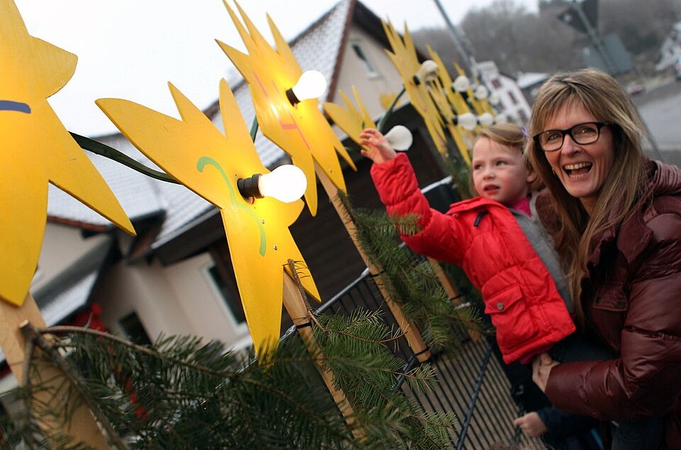 Schleiden-Gemünd - Seit dem ersten Dezember schmücken 24 große Weihnachtssterne den Eingang des Rotkreuz-Kindergartens am Kreuzberg und damit zugleich eine der Hauptzufahrtsstraßen in den Nationalparkort Gemünd. „Jeden Tag gehen die Kinder nach draußen zu ihrem Adventskalender, drehen stolz die nächste Birne ein und sagen ein Gedicht auf“, erzählt Andrea Wollgarten, die Leiterin des Rotkreuz-Kindergartens.