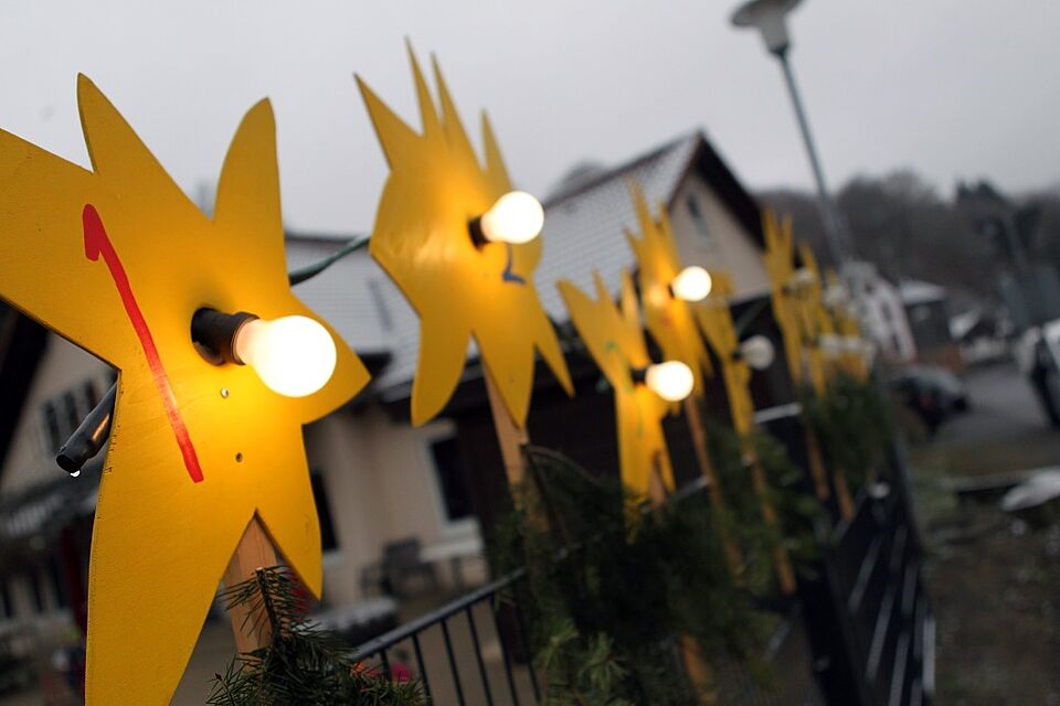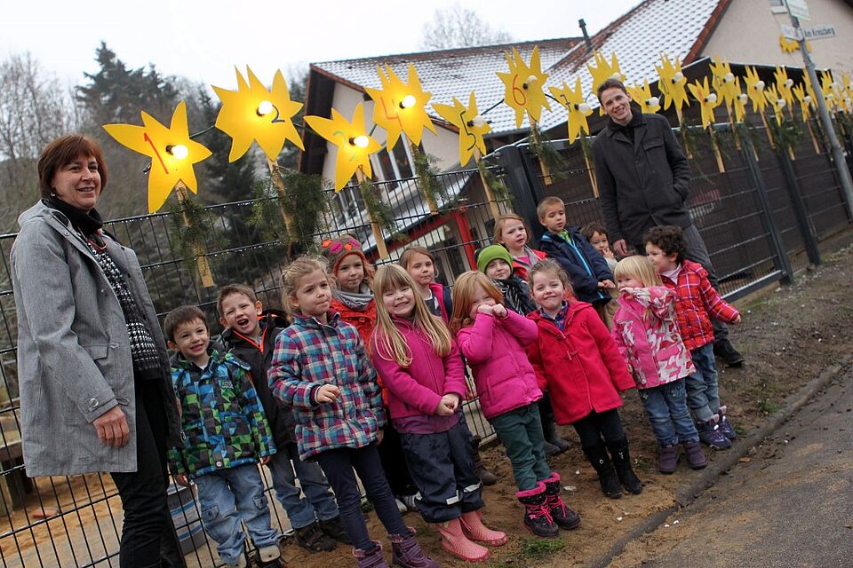Die 40 Kinder im Alter von zwei bis sechs Jahren jedenfalls freuen sich riesig und erleuchten jeden Tag bis zum Heiligen Abend den selbst gebastelten Adventskalender. Die 24. Birne hängt unterm Dachgiebel und ist für alle schon von weitem sichtbar. Wollgarten weiß, dass sich auch die Autofahrer und Passanten über das helle Leuchten am Fuße des Kreuzberges erfreuen.