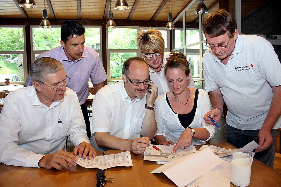 Vom strategische Leitungsteam, zu dem neben Rolf Klöcker und Janine Frackmann auch die stellvertretende Kreisvorsitzende Edeltraud Engelen, der Fachbereichsleiter Migration und Soziales Bodo Froebus, Kreisbereitschaftsleiter Jürgen Houbé, Fahrdienstleiter Thomas Heinen sowie der technische Beauftragte Herbert Schmitz gehören, ist in solchen Momenten viel Spontanität gefragt. Der Anruf der Bezirksregierung platzte mitten in eine Lagebesprechung des Rotkreuzteams mit der Heimleiterin Edith Stoffels und der Küchenchefin Ursula Voiks, in deren Rahmen auch Bürgermeister Udo Meister sich über deren Stand der Dinge erkundigte.