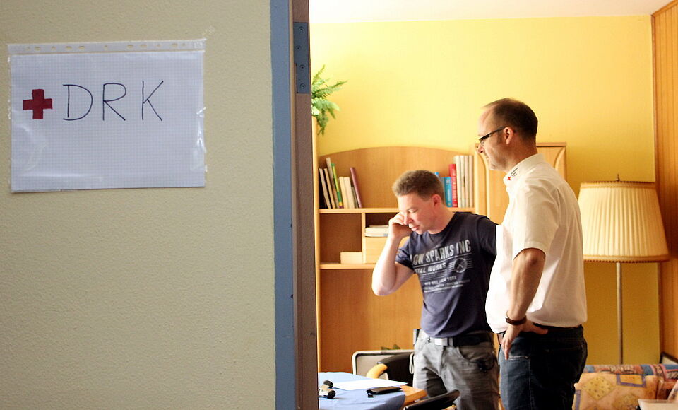 „Das Wochenende haben wir genutzt, um trotz der Ferienzeit ehrenamtliche Helfer zu akquirieren“, so Klöcker. Mit Erfolg: 15 Rotkreuzler erklärten sich spontan bereit, zu helfen. Die Flüchtlinge sollen zunächst tagsüber von vier bis sechs und nachts von zwei Rotkreuzlern betreut werden. Auch für Janine Frackmann, die Leiterin der zum 1. Juli eingerichteten Flüchtlingsberatungsstelle des Roten Keuzes im Kreis Euskirchen, wurde vor Ort ein Büro eingerichtet.