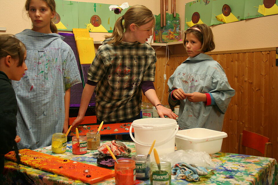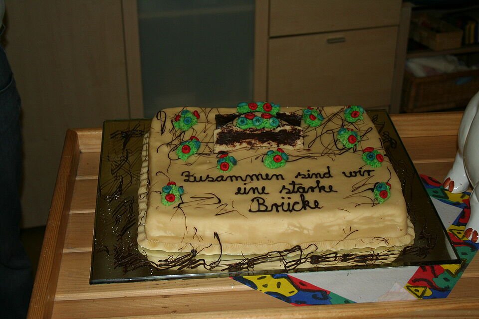 Ein Vater hatte im Vorfeld eine Brücke aus Holz hergestellt, die die Kinder den ganzen Tag mit bunten Steinen bekleben konnten.