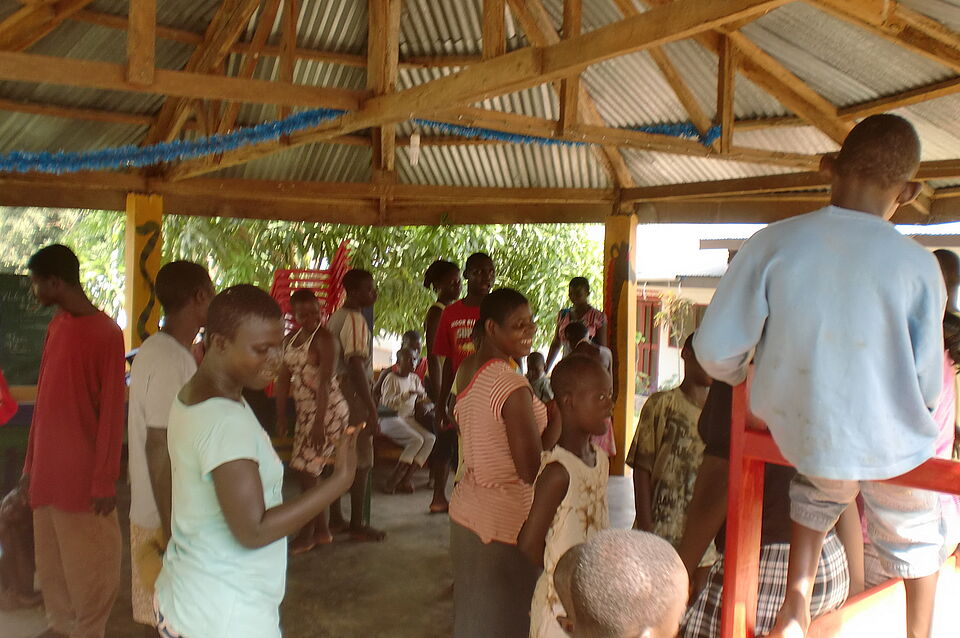Nach 12 Stunden Reisezeit erreichten wir dann verschwitzt, müde und klebrig von der Aktion mit dem Brei, Nkoranza. Tettey war in den letzten Stunden zunehmend knatschig und verstimmt gewesen, was ich ihm nach dieser “Mammutreise” auch nicht verübeln konnte. Die Fahrt hatte uns allen übel mitgespielt. Die allgemeine Stimmung war auf dem Tiefpunkt. Das änderte sich jedoch schlagartig, als wir das Gelände der „Hand in Hand Community“ erreichten. Dort wurden wir bereits erwartet und vom Communityleiter Albert herzlichst willkommen geheißen.