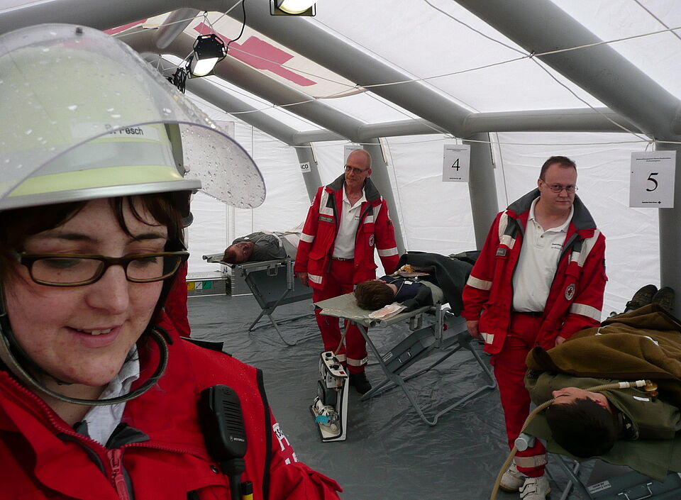 Bild DRK ZR | Die Zugführerin Bianca Pesch aus Kall führt einen Bereich im Behandlungsplatz.