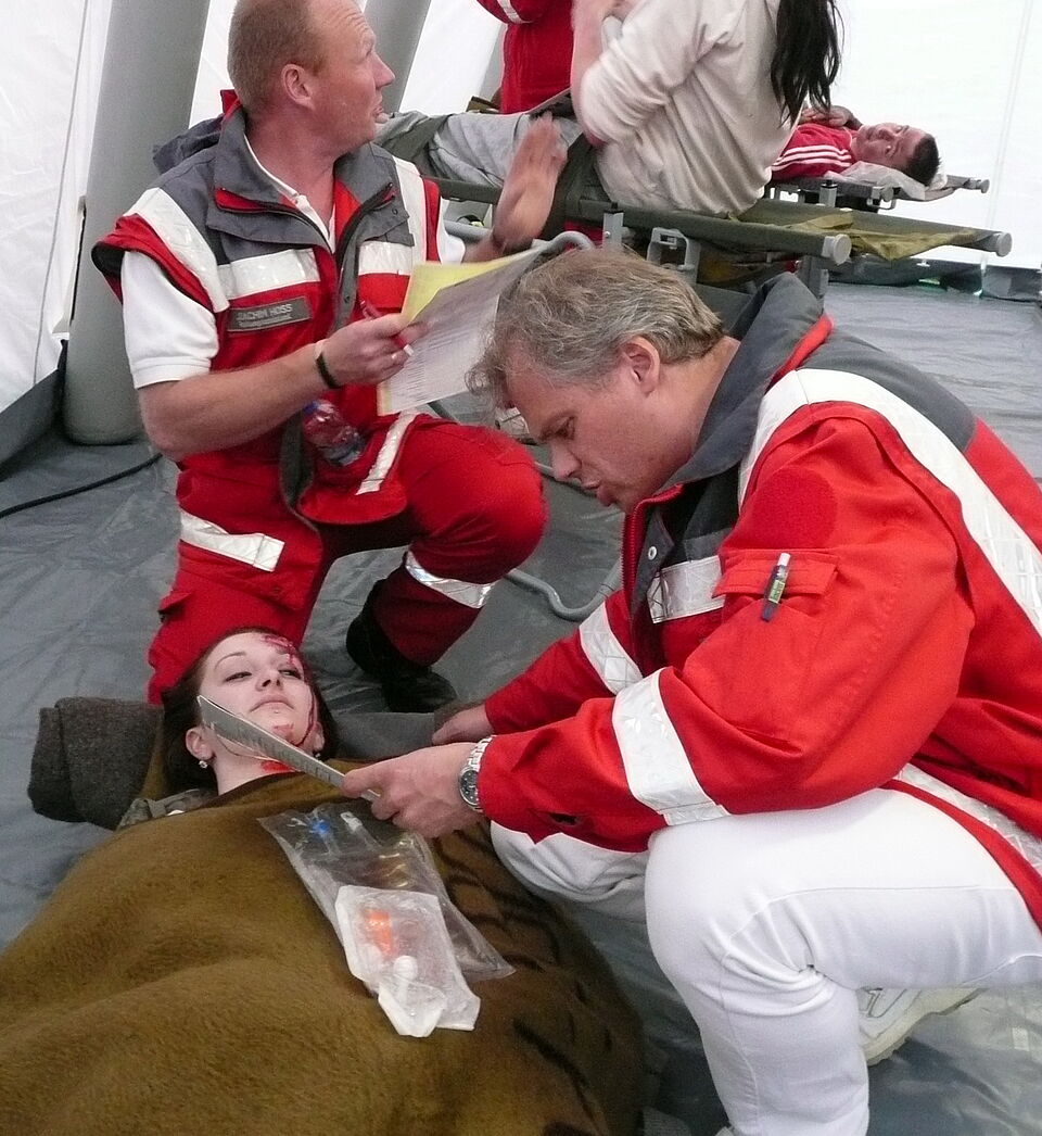 Bild DRK ZR | Der Rotkreuz Rettungsassistent Joachim Hoss aus Engelgau und ein Notarzt betreuen eine Patientin im Behandlungsplatz.