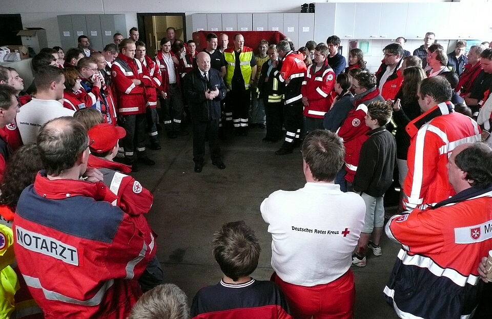 Bild DRK ZR | 36 Teilnehmer eines Lehrgangs zum leitenden Notarzt oder oranisatorischen Leiter Rettungsdienst aus der ganzen Bundesrepublik beobachten das Übungsgeschehen.