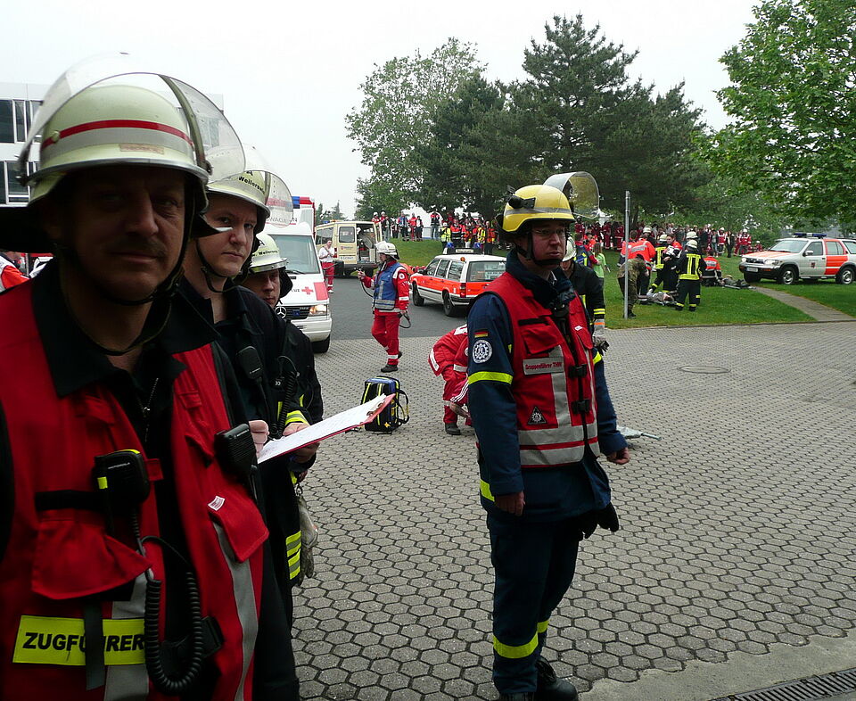 Bild DRK ZR | Einsatzkräfte von Feuerwehr und technischem Hilfswerk warten vor der Tiefgarage auf ihren Einsatzbefehl. Im Vordergrund ein Zugführer der Feuerwehr.