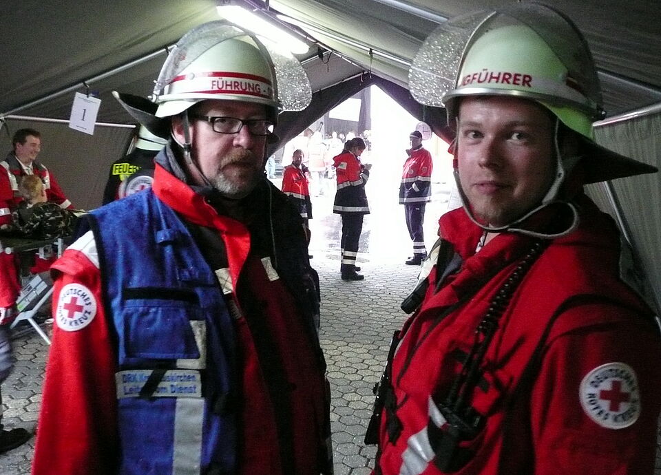 Bild DRK ZR | Schnell war vergessen, dass es sich um eine Übung handelte. Betroffenheit in allen Gesichtern. Der Schleidener Notarzt Thomas Hergarten (li) und der Rotkreuz Rettungssanitäter Thomas Moll aus Eusirchen (Mitte).