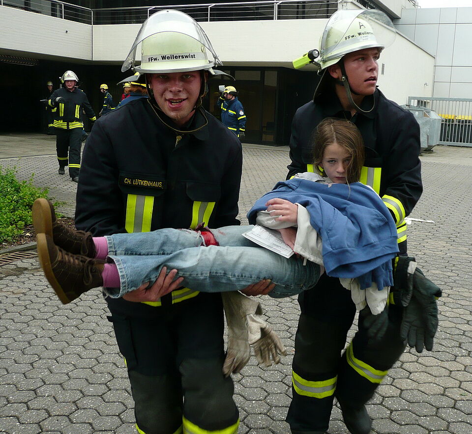 Bild DRK ZR | Zwei Feuerwehrleute halfen spontan und beherzt, um eine Verletzte aus dem direkten Gefahrenbereich zu retten.