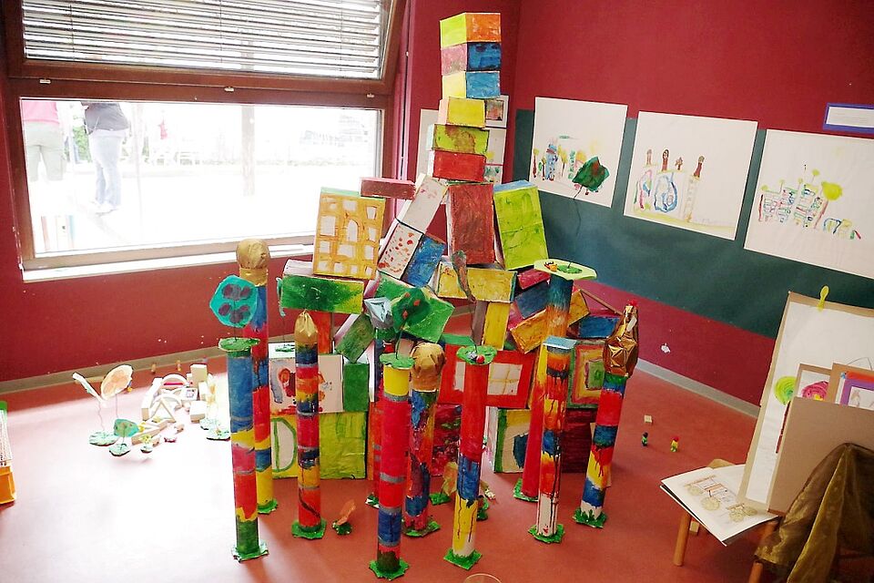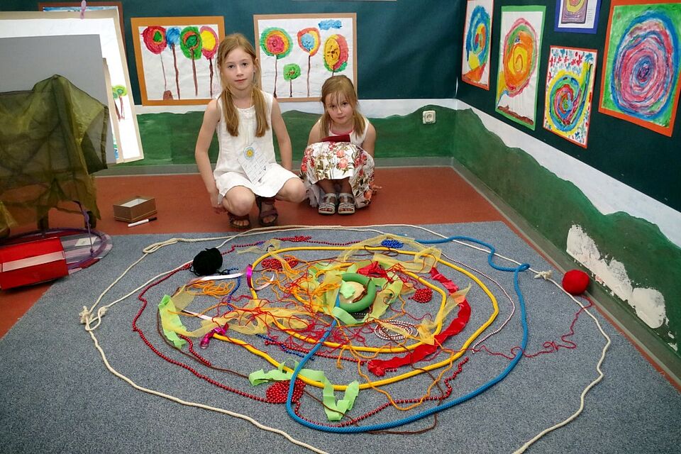 Überhaupt hatte sich die Kita in ein riesiges Atelier verwandelt. Denn zum Jubiläum hatten die 86 Kinder seit Februar unzählige Kunstwerke geschaffen. So hatten sie etwa Steine und Astgabeln im Wald gesammelt und sie in Glitzersteine und Waldgeister verwandelt, Masken, Eidechsen und Hühner aus Pappmaché kreiert, Lampen aus Joghurtbecher entworfen, Männchen aus Blechdosen zum Leben erweckt, verschiedene Maltechniken ausprobiert, an Hundertwasser orientierte Werke geschaffen und einen Webteppich hergestellt.