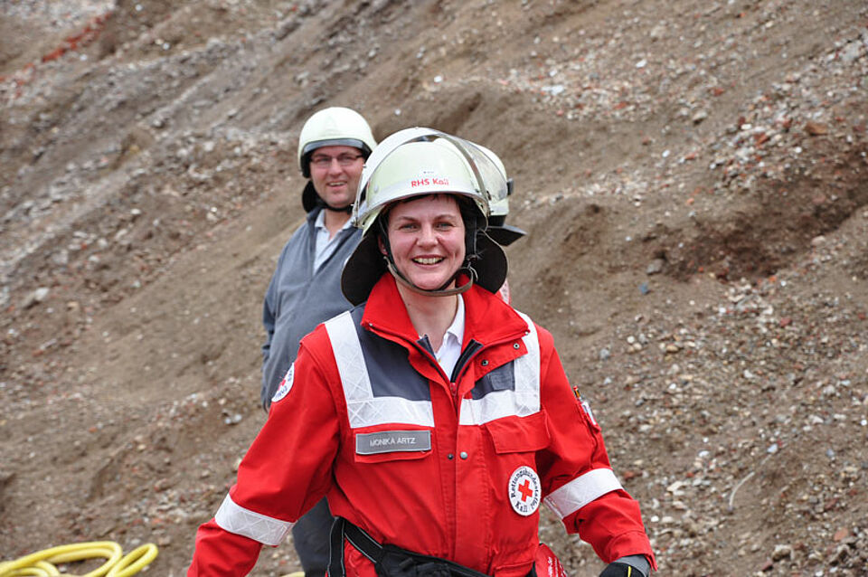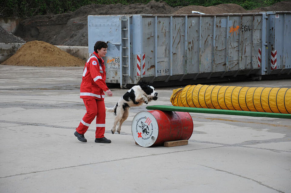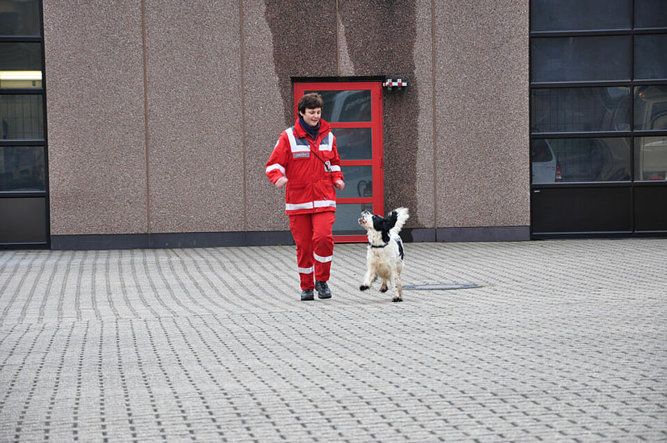 Anschließend fand für Rettungshund „Tristan“ die Gehorsamsübung statt, ehe es nach der Geräteprüfung auf dem Gelände eines Abbruchunternehmens auf die Suche nach mehreren Verschütteten ging. Die beiden Rettungshundeprüfer Michael Kielau und Almuth Schaefer bescheinigten dem Rotkreuz-Team aus Kall eine durchweg gute Leistung.