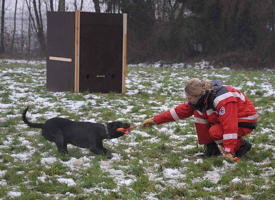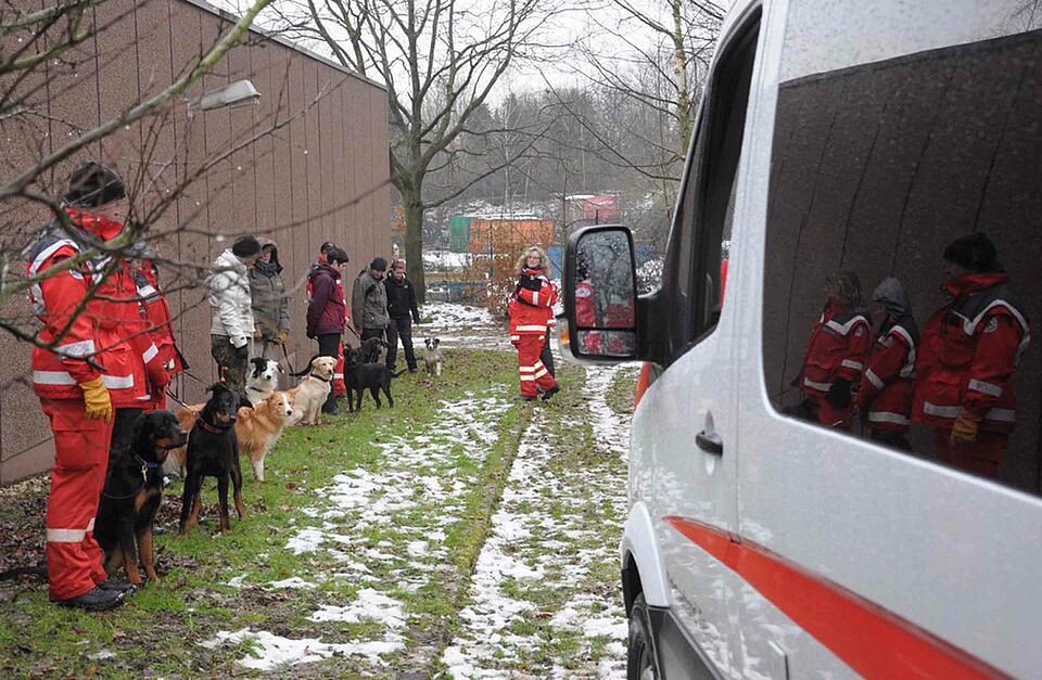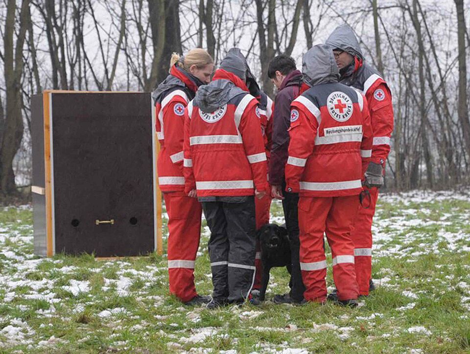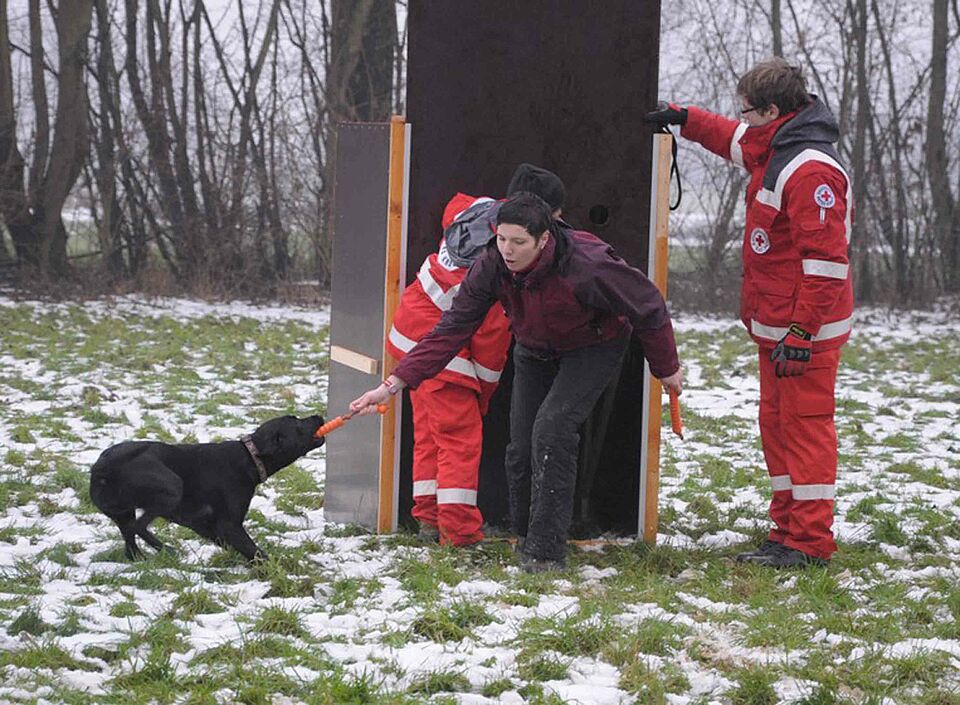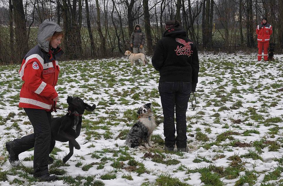 Güdderath – Michael Meertz, der stellvertretende Leiter des Rettungshundewesens im Landesverband Nordrhein des Deutschen Roten Kreuzes (DRK), konnte mehr als zufrieden sein: Der Nachwuchs an Hundeführern in "seinem" DRK-Landesverband ist gesichert. Neun Nachwuchs-Suchhunde waren zum Rettungshunde-Eignungstest zum Katastrophenschutzzentrum in Mönchengladbach-Güdderath angetreten. Das erfreuliche Ergebnis: Alle neun Hunde legten vor den drei Eignungstest-Bewerterinnen, Ingrid Grimm, Ulrike Ernst und Gaby Hüpkes-Meertz, durchweg gute Leistungen ab.