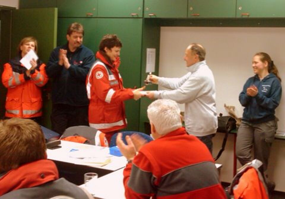 Monika mit „Tristan“ und Julia mit „Lena“ schafften ihre Erstprüfung. Außerdem erhielten die stolzen Erstprüflinge - so ist es im Landesverband Nordrhein üblich - einen kleinen Pokal, der sie an ihre erste Prüfung erinnern soll. Jochem mit „Ustrix“ bestand seine turnusmäßige Wiederholungsprüfung. Es war insgesamt eine hohe Herausforderung, schließlich legten nur vier von elf gestarteten Teams (Staffeln vom Roten Kreuz und Johanniter) an diesem Sonntag die Flächensuchprüfung in Mönchengladbach-Güdderath erfolgreich ab.